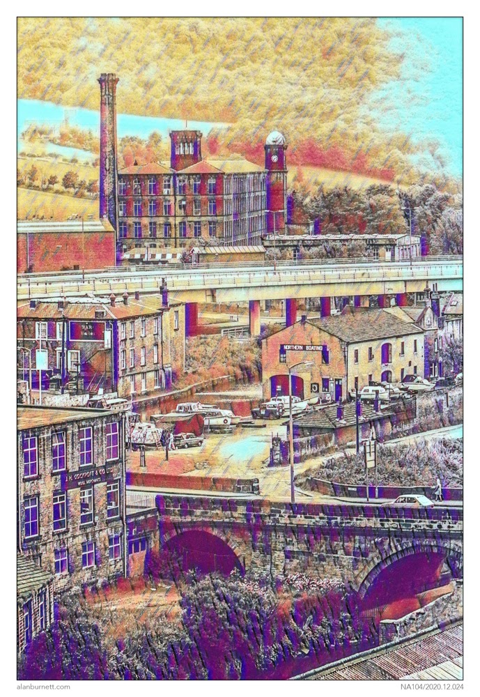 I must have taken the original photograph from Hullen Edge, looking down towards Elland Bridge. It was the mid to late 1970s: what is now the Barge and Barrel was then the Bar Bados and the bypass was still as bright as a concrete button. The mills were still working and the trees on the hillside merged into an unrealistically blue sky.