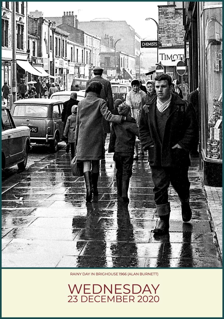 A wet day in Brighouse, fifty-four years ago. Full of memories – donkey jackets, mini cars and Timothy Whites chemist. More resonant in these difficult times, memories of crowded pavements and social interaction.