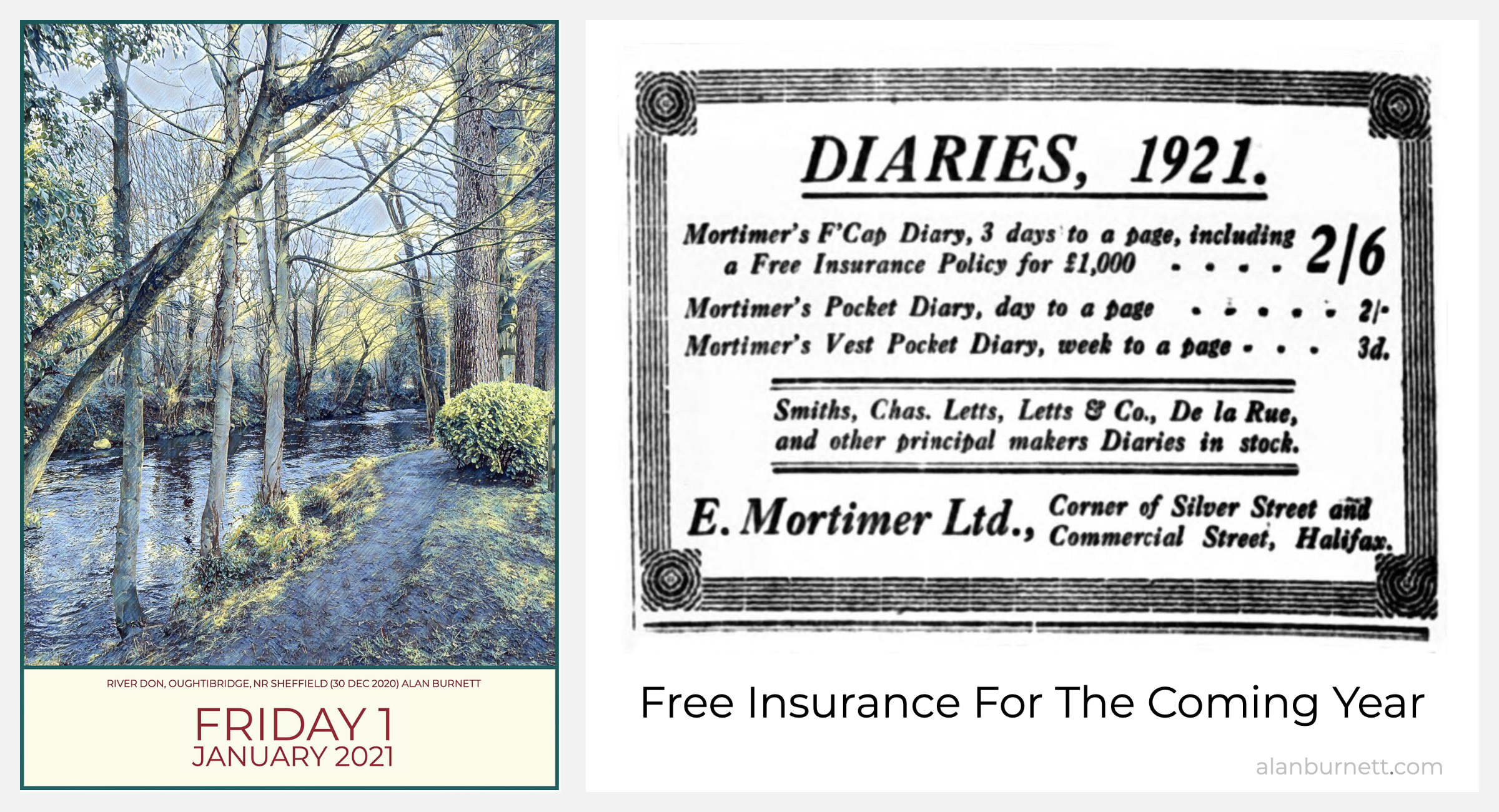 Had I been tempted to start the more traditional type of diary I could have done worse than take up the offer made by the Halifax stationery and printing company, E Mortiner Ltd, in an advert in the Halifax Evening Courier exactly 100 years ago today. From their shop at the corner of Silver Street and Commercial Street you could buy, for just a half crown (twelve and a half pence to those of a shorter life-span), a Foolscap Diary – three days to a page – and they would throw in a free insurance policy for £1,000 for the coming year.