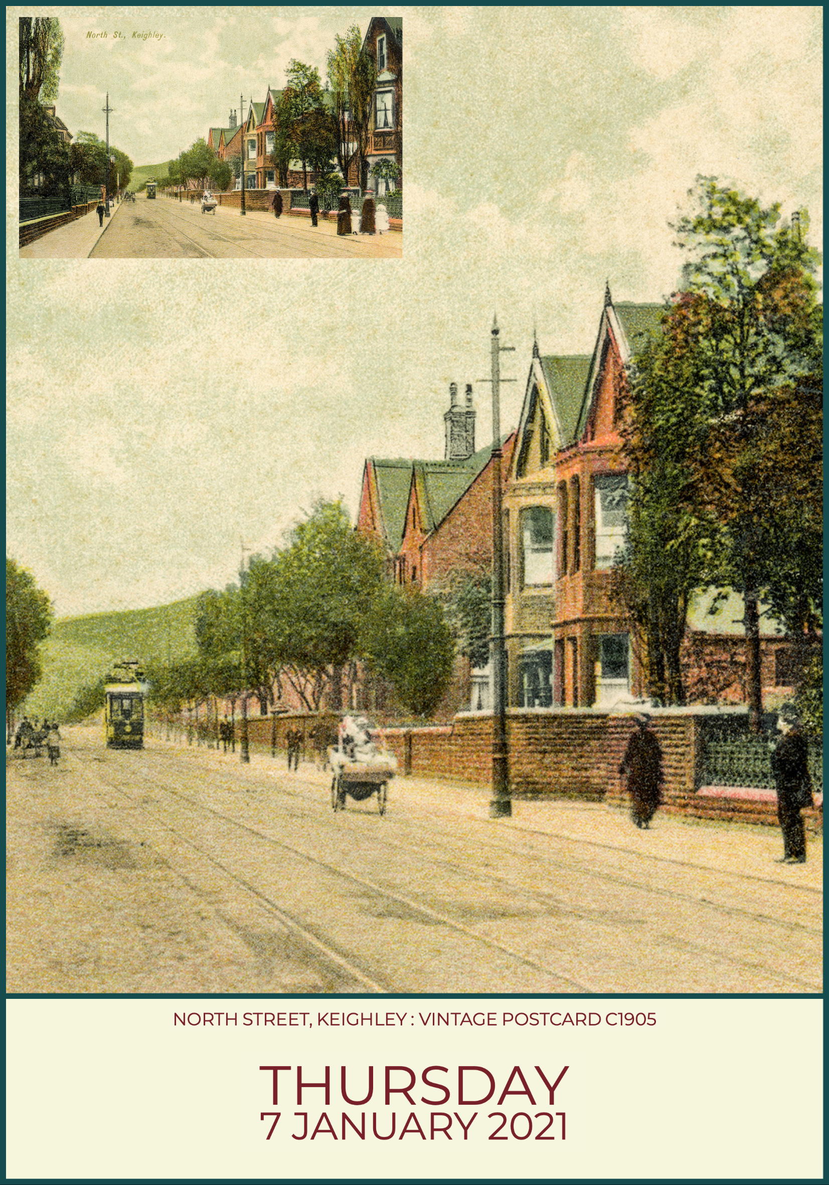 My love of old vintage picture postcards goes back to my childhood when I would accompany my mother on occasional visits to her uncle, who lived in Keighley, the town of her birth. Fowler Beanland, who was always known in the family – without any trace of sarcasm – as “Uncle Fooler”, lived in what was at the time, a smart terraced house a few minutes walk from the town centre. I would look forward to such visits because the preferred way of keeping me quiet whilst the grown-ups discussed family matters, was to let me look through Fowler’s album of old postcards. He had collected these postcards during the great postcard-collecting craze of the first decade of the twentieth century. When I used to look at the album, when I was a child of six or seven, they would appeal to me because of their colour and their depiction of exotic locations such as Rochdale, Carlisle and Blackpool. Later, when I inherited the album, they would appeal to both my love of old photographs and my fascination for family history. I still have the collection intact, and I look forward to passing it on to my grandchildren. My desktop calendar image today features just one of these postcards, a view of North Street in Keighley in the early 1900s.
