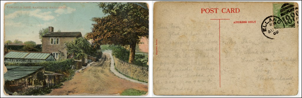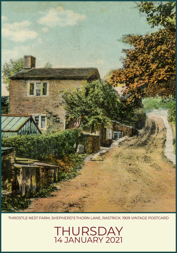 My calendar image today features a view of Throstle Nest Farm in Shepherd’s Thorn Lane, Rastrick, which is only a few minutes walk away from where I live. The farm is long gone, all that remains is part of a vaulted cellar, and therefore this chance to see it as it would have been 100 years ago is a welcome one. The image comes from an old vintage postcard I recently acquired. There is a message on the back, but it has faded into mysterious obscurity.
