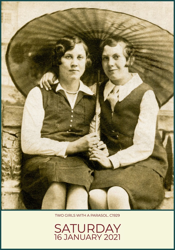 My calendar today features a photograph from over ninety years ago of two girls posing in a seaside studio with a parasol. The photograph was taken in Cleethorpes on the stormy east coast of Britain, where parasols tended to be confined to the photographers’ studio. The date of the photograph I estimate as 1929 or there about. The young girl on the right of the picture, as we look at it, is my mother, Gladys. I remember her telling me about the photograph when, as a child, I would leaf through the photograph albums. Was the other girl called Florrie? – I forget. They were two young girls on a day trip to the seaside from their jobs in the woollen mills of Bradford. It was a lifetime ago – and, as I face the prospect of trudging through the snow today, it feels increasingly like two lifetimes ago. But after my trip out to walk the dog, I can come back into my slightly warmer office and look at that smile I remember so well.