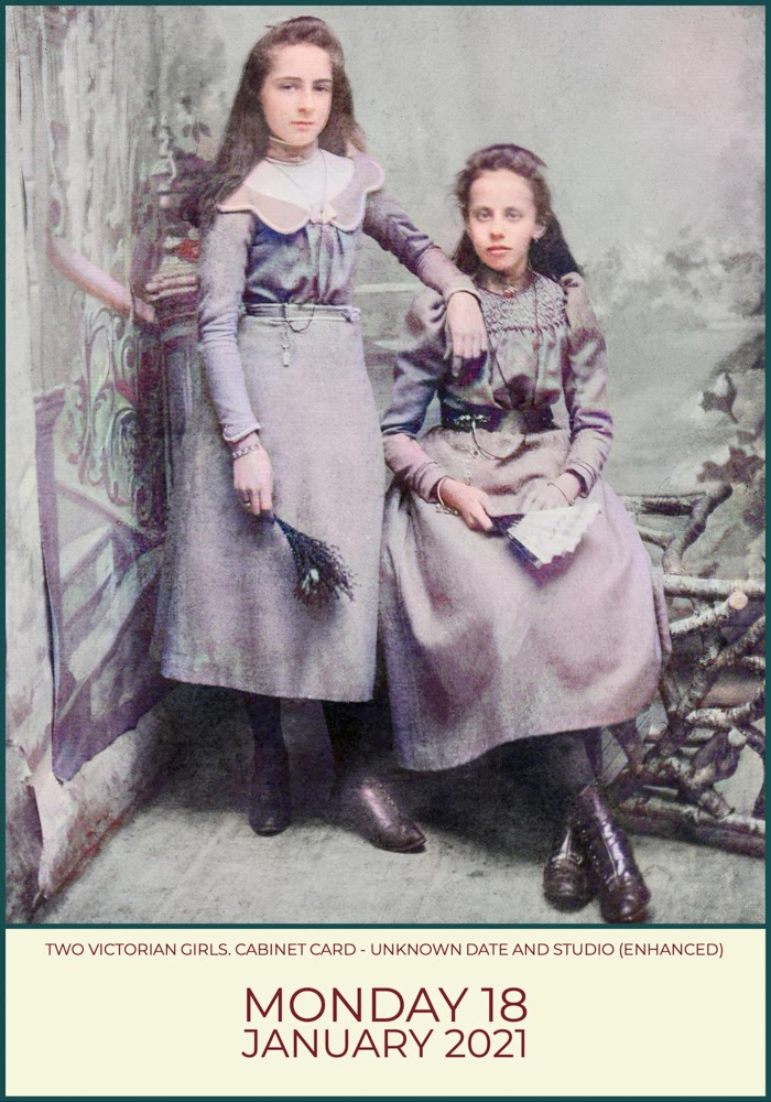 I still can’t make my mind up about AI. Artificial intelligence (AI) colourising programmes are all the rage: smart little apps where you can feed a monochrome image in at one end, and a beautifully realistic full-colour rendition emerges from the other end. To be honest, sometimes it is beautiful, sometimes realistic and sometimes it is colourful, but rarely all three. And sometimes it has the look of the kind of thing a three-year old, fed too much chocolate and given too many coloured crayons, would produce. I get to thinking that the old, faded, and bleached-out vision of faces from a bygone era is more lifelike than some daisy-fresh technicolour dream. And then I feed another old Victorian pasteboard photo into the AI machine and see life emerge, and it takes me back to the thrill I used to get when black and white images would slowly emerge from a dish of developer solution. As I say, I can’t make my mind up about AI. I will spend the day with these two colourful Victorian girls and see what they say about artificial intelligence.