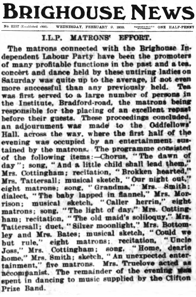 ILP MATRONS’ EFFORT. The matrons connected with the Brighouse Independent Labour Party have been the promoters of many profitable functions in the past and a tea, concert and dance held by these untiring ladies on Saturday was quite up to the average, if not more successful than any previously held. Tea was first served to a large number of persons in the Institute, Bradford Road, the matrons being responsible for the placing of an excellent repast before their guests. These proceedings concluded, an adjournment was made to the Oddfellows’ Hall, across the way, where the first half of the evening was occupied by an entertainment sustained by the matrons. The programme consisted of the following items:—Chorus, “The dawn of day”; song. “And a little child shall lead them.” Mrs. Cottingham; recitation. “Broken hearted.” Mrs. Tattersall; musical sketch, “Our night out.” eight matrons; song, “Grandma,” Mrs. Smith: dialect, “The baby lapped in flannel.” Mrs. Morrison; musical sketch. “Caller herrin,” eight matrons; song. “The light of day.” Mrs. Cottingham; recitation. “The old maid’s soliloquy,” Mrs. Tattersall; duet. “Silver moonlight.” Mrs. Bottomley and Mrs. Bates; musical sketch. “Could we but rule.” eight matrons; recitation ” Uncle Joss.” Mrs. Cottingham; song, “Home. dearie home,” Mrs. Smith; sketch, ” An unexpected entertainment,” five matrons. Mrs. Truelove acted as accompanist. The remainder of the evening spent in dancing to music supplied by the Clifton Prize Band.