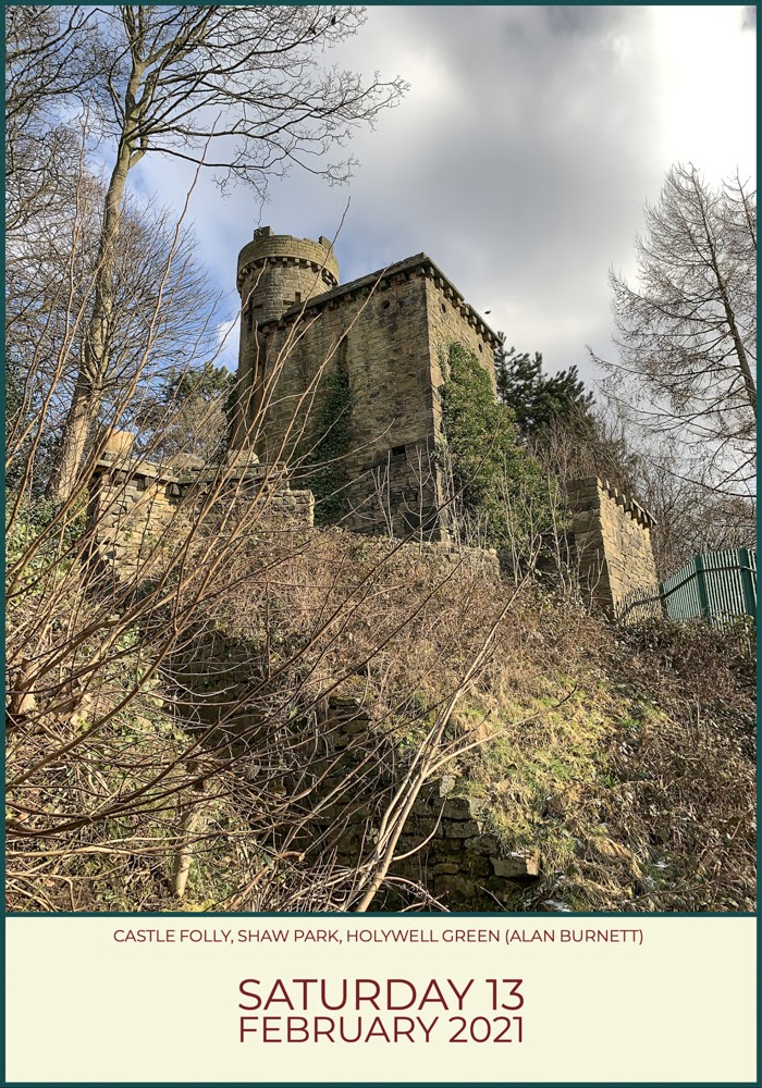 We took a walk in the park yesterday. The park in question was Shaw Park in Holywell Green, near Halifax (No. 46 in “The Forgotten Parks of Yorkshire“, which is a book I have yet to write). It was one of the coldest days of the year, but even the icy blast coming straight down the valley from Siberia by way of Spitsbergen, could not spoil the delights of this curious little park, that, as with so many great little parks, started life as somebody’s garden. The house itself – Brooklands which was sadly demolished in 1933 – was built for the mill-owning Shaw family just above their massive Brookroyd Mill (also demolished) which at one time employed 1,200 workers. For entertainment, the Shaws built a variety of castle-like follies in the grounds and these remain to warm the heart – if not the arms and legs – on a cold winters’ day.