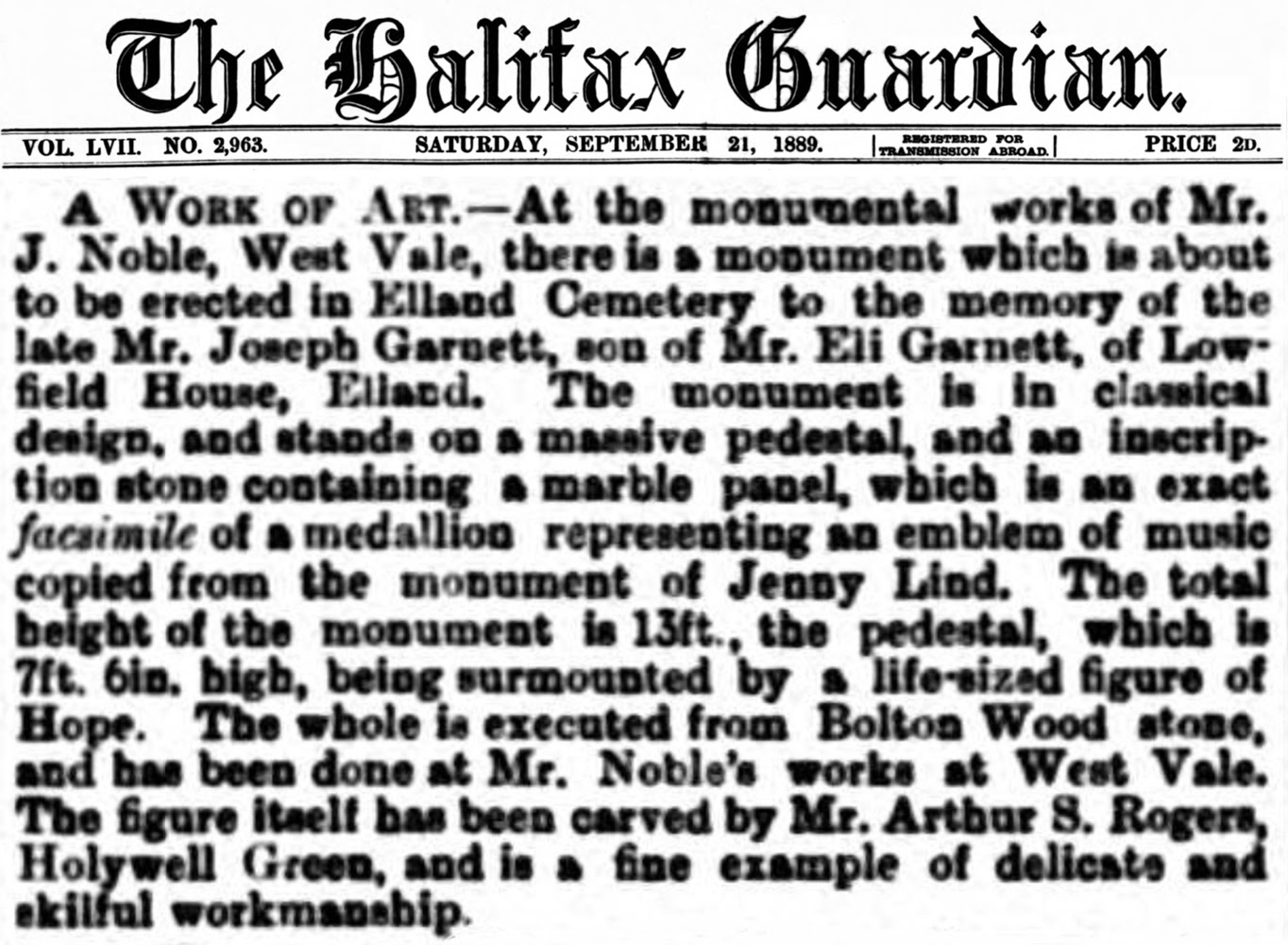 “A WORK OF ART – At the monumental works of Mr J Noble, West Vale, there is a monument which is about to be erected in Elland Cemetery to the memory of the late Mr Joseph Garnett, son of Mr Eli Garnett, of Lowfield House, Elland. The monument is in classical design, and stands on a massive pedestal, and an inscription stone containing a marble panel, which is an exact facsimile of a medallion representing an emblem of music copied from the monument of Jenny Lind. The total height of the monument is 13ft, the pedestal, which is 7ft 6in high, being surmounted by a life-sized figure of Hope. The whole is executed from Bolton Wood stone, and has been done at Mr Noble’s works at West Vale. The figure itself has been carved by Mr Arthur S Rogers, Holywell Green, and is a fine example of delicate and skilful workmanship”
