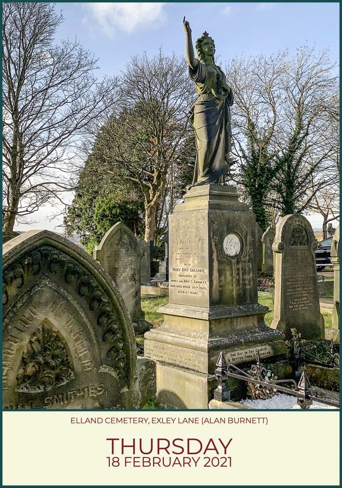 According to my Little Oxford Dictionary, the definition of “wandering” is to aimlessly move from place to place in a casual fashion. That being the case, I declare myself a wanderer, indeed I will consider putting that down as my religion when the census forms arrive in a few weeks time. The Lockdown places a severe restriction on my ability to aimlessly wander, of course, but even within the confines of a definable “local area”, I am still able to practice my religion. Yesterday we wandered around the lower part of Elland and up Exley Bank (like all good religions, wandering needs a bit of sacrifice in its devotions – that’s why hills were invented), and for the first time in my life, I discovered Elland Cemetery. For those who haven’t been, it is one of those expansion cemeteries, added to towns in the nineteenth century when the local churchyard became too full. It occupies a spot high on the hill, looking down on where Elland Hall used to stand, and where endless vehicles now by-pass Elland. There are some fine gravestones and monuments, but one in particular caught my eye – a fine stone statue that appeared to be pointing departed souls in the direction of Ainley Top and the road to Huddersfield.