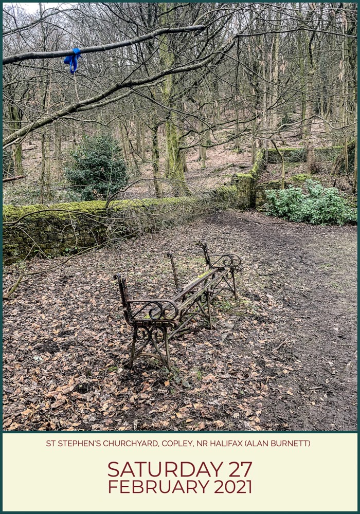 We took the dog for a walk yesterday, up the hill from Copley. It’s a steep hill and hard work on the knees, but I had to run up there sixty years ago on school cross country runs, so I don’t see why my wife and dog should escape the same pleasurable experience. Before facing the hill we took a walk around St Stephen’s churchyard – I was looking for more pointing ladies, but that is another story. I couldn’t help wondering how they manage with burials now that there is only a footbridge over the river, but I am in no hurry to find out the answer. The graveyard looked almost Autumnal – just as if nature too had been in lockdown. I think the blue ribbon on the tree branch is something to do with thanking essential workers, which would be a nice thought. There again, it might be an abandoned dog waste bag, which would be a nasty thought.