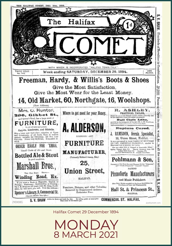 A couple of years worth of copies of a newspaper called “The Halifax Comet” have just been added to the collection of the ever-splendid British Newspaper Archives, and as I had never heard of this newspaper, I was anxious to dive in and see what it was like. I would like to report back and say that it was full of insightful reporting about conditions in the town at the close of the nineteenth century, but I am unable to do so – because I couldn’t really understand a word of it. The entire thing is written in a strange style that contains vaguely recognisable words that have been drained of all meaning by the way they have put together. To illustrate my point, I will quote just one paragraph in the leading article of the edition of the 29th December 1894. It comes from an article which appears to be about the appointment of abstaining vegetarians as Poor Law Guardians!
