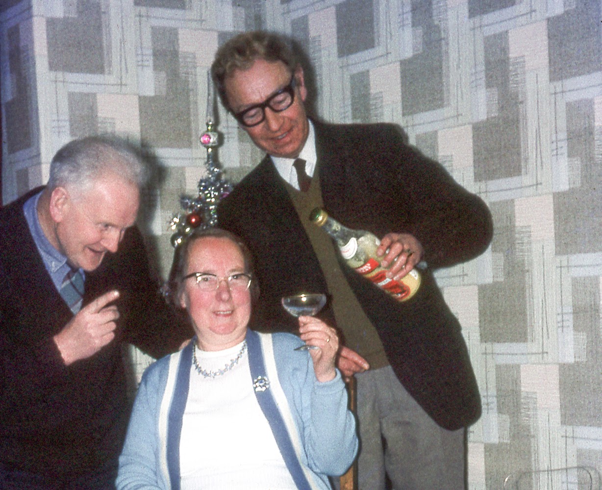 These two photographs were taken at a Christmas Party at my parent’s house, sometime around 1965. They are full of memories, and by themselves could provide a rich itinerary for a week’s worth of time travel. The table with the Christmas drinks – it was always a bottle of advocaat, a small bottle of Babycham, and a bottle of sweet sherry. There may have been some port left over from a previous Christmas, but I can’t recall there ever having been beer, and wine was unheard of. There is that wallpaper which is guilty of assault and battery on the senses, and the posed expressions on the faces of my aunts and uncles. There was a dish of biscuits – maybe even a chocolate one – an artificial tree and a warm sausage roll or two. It was a moment or two in time, captured within the cardboard confines of a colour slide. Now it is a rich vein of memories.
