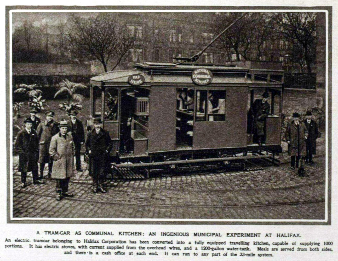 “An electric tramcar belonging to Halifax Corporation has been converted into a fully equipped travelling kitchen capable of supplying 1,000 portions. It has electric stoves, with current supplied from the overhead wires, and a 1,200 gallon water-tank. Meals are served from both sides and there is a cash office at each end. It can run to any part of the 33 mile system.”