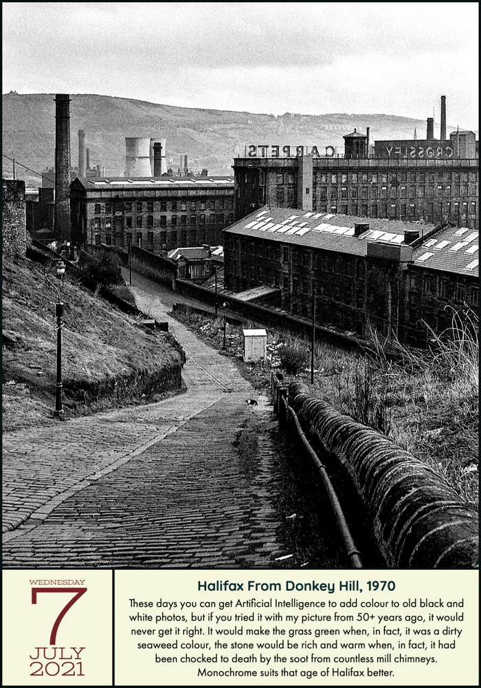 These days you can get Artificial Intelligence to add colour to old black and white photos, but if you tried it with my picture from 50+ years ago, it would never get it right. It would make the grass green when, in fact, it was a dirty seaweed colour, the stone would be rich and warm when, in fact, it had been chocked to death by the soot from countless mill chimneys. Monochrome suits that age of Halifax better.