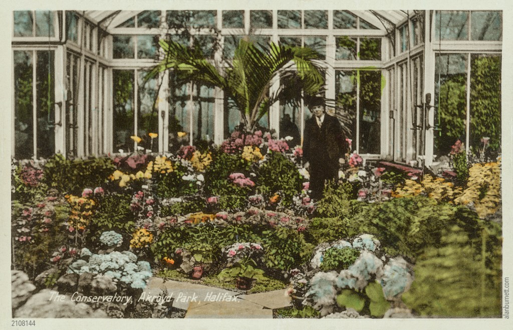 This immensely colourful postcard of the conservatory at Akroyd Park in Halifax must date from the first decade of the twentieth century, although it is difficult to date it precisely as it was never posted. Bankfield House, the home of Edward Akroyd, and its grounds, were sold to Halifax Corporation in the 1880s and converted into a park, library and museum. In Victorian times, no grand garden was complete without a cast-iron conservatory, sheltering the delicate flowers from, not only the cruel English climate, but also the choking English smog.