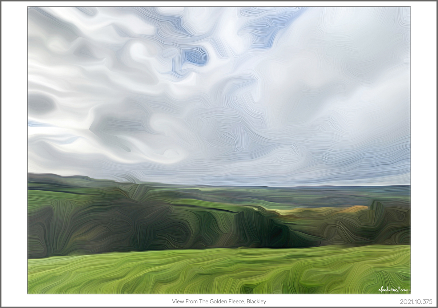 There must be a name for the valley that runs down from Blackley to Holywell Green. It’s the valley you see if you breakfast at the Farm Shop cafe at Lindley Moor. It’s the valley you see as you leave the Golden Fleece pub. When I left the latter, earlier today, I was frighteningly sober, but still the greens merged together to form something almost Turner-ish.