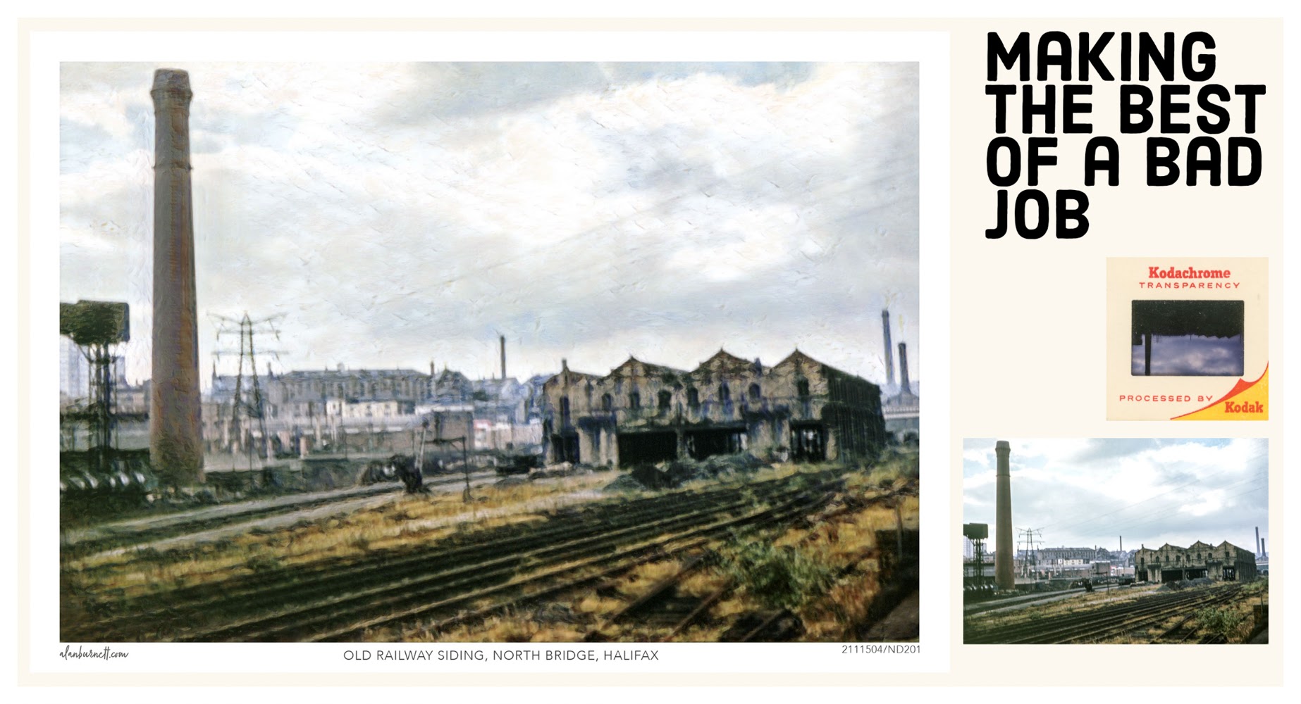 Not all photographs are good photographs. These days we get instant results from our digital cameras and smartphones, and those that are out of focus, under-exposed or decapitating the heads of relatives, can be instantly deleted. Back in the Film Age, however, the seasons could change between the shutter clicking and the prints arriving. This means that half a century later you come across an old, under-exposed, scratched and out of focus colour slide, and you have to try and make the best of a bad job. The best I could do with this photograph of the old railway sidings near North Bridge in Halifax, is to turn it into a nineteenth century painting.