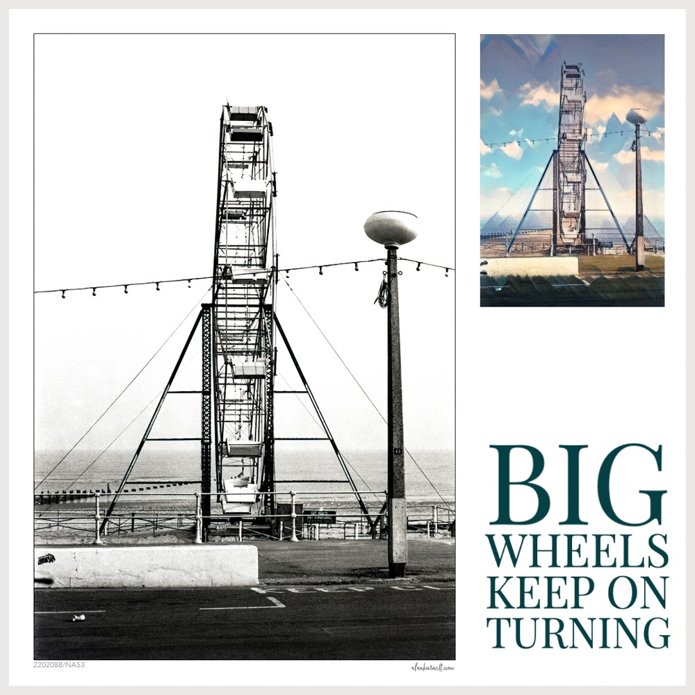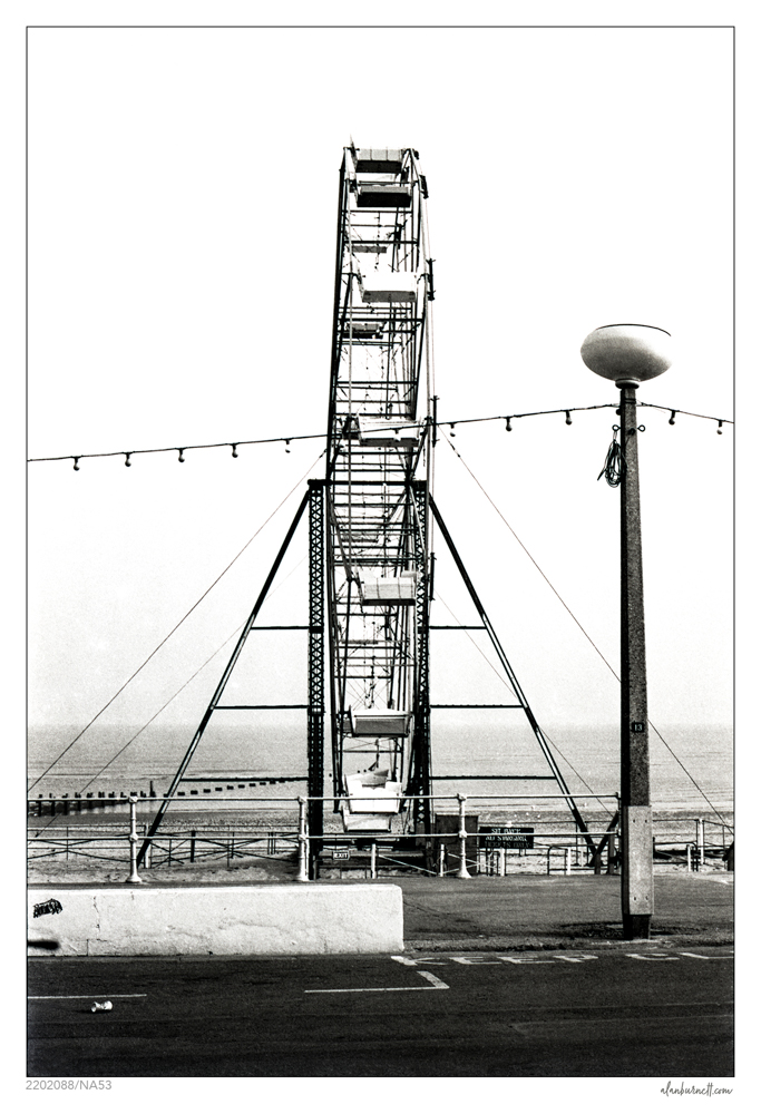 The 1980s were a difficult years for me in some ways. Over the course of decade, I was gradually losing my hearing, and gradually learning to live with the knowledge that it would not be returning. In some ways it was like going into a personal lockdown. At the time we were living in Sheffield and I was finding work difficult to cope with – teaching needs to be an interactive experience if it is going to be rewarding. I used to find some kind of solace in visiting Grimsby and Cleethorpes – although I can’t, for the life of me, tell you why – and there I would take photographs of abandoned fish docks and deserted seaside attractions. This is one of my photographs from that time of the “big” wheel in Cleethorpes.