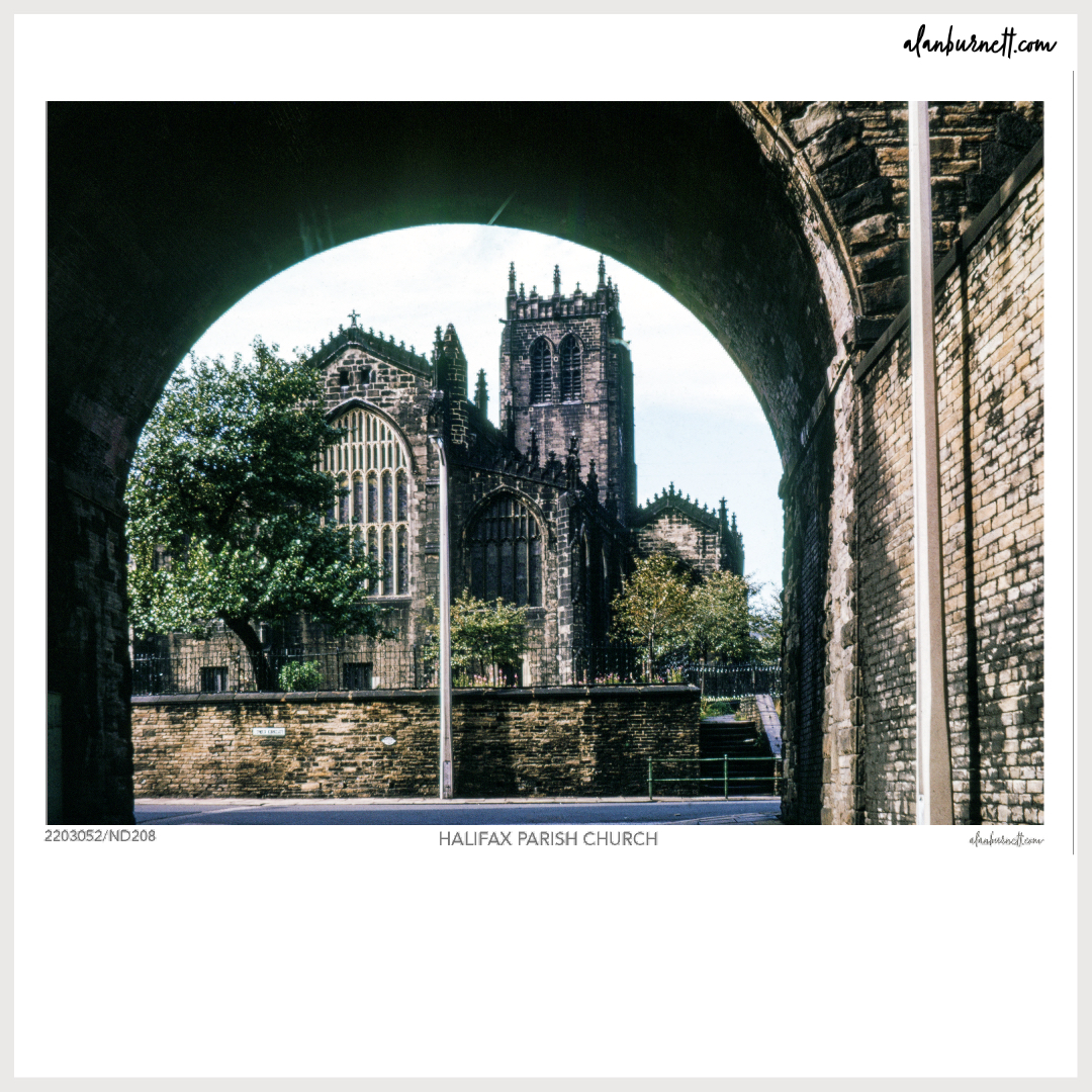 This is one of my photographs from forty or fifty years ago. The building is, of course, instantly recognisable: it is what was then Halifax Parish Church, and is now Halifax Minster. The frame will not be as instantly recognisable: the railway viaduct that carried the line from Halifax Station to North Bridge has been demolished for many years now.