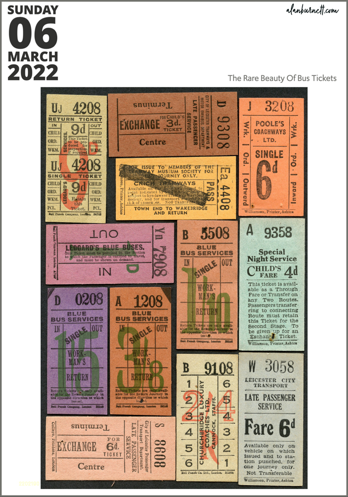 There is something rather beautiful about old bus tickets. Those stout cardboard ones from seventy or so years ago, or those brightly coloured paper ones of forty or fifty years ago – there is both a tactile and visual pleasure in both. Where they exist today, bus tickets are meaningless strips of white paper, nothing but litter-fodder.