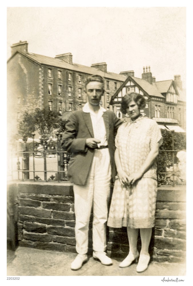 Another photograph from the family archives – this one features my fathers’ sister, Annie, with her husband Harry Moore. Precisely dating such photographs is always a challenge, but I would guess that this was taken around the time of their marriage in 1933. By then, Harry would have abandoned his career as a member of a touring entertainment concert party, and settled down to a life working in an office in Bradford. And marriage meant that Annie could leave the local mill and become a full-time housewife. The photograph lacks some of the sophistication visible in photos of the couple taken later in the 1930s. Even if I can’t precisely date it, I can perhaps place it on a tentative time-line of their photographic history.