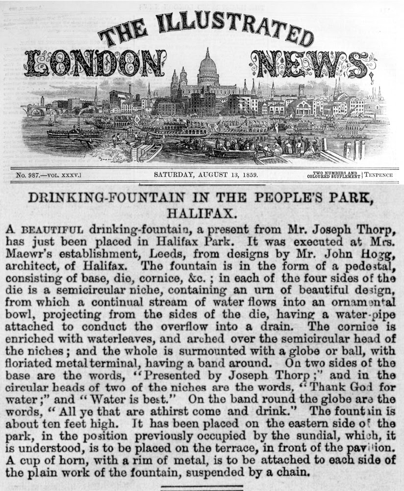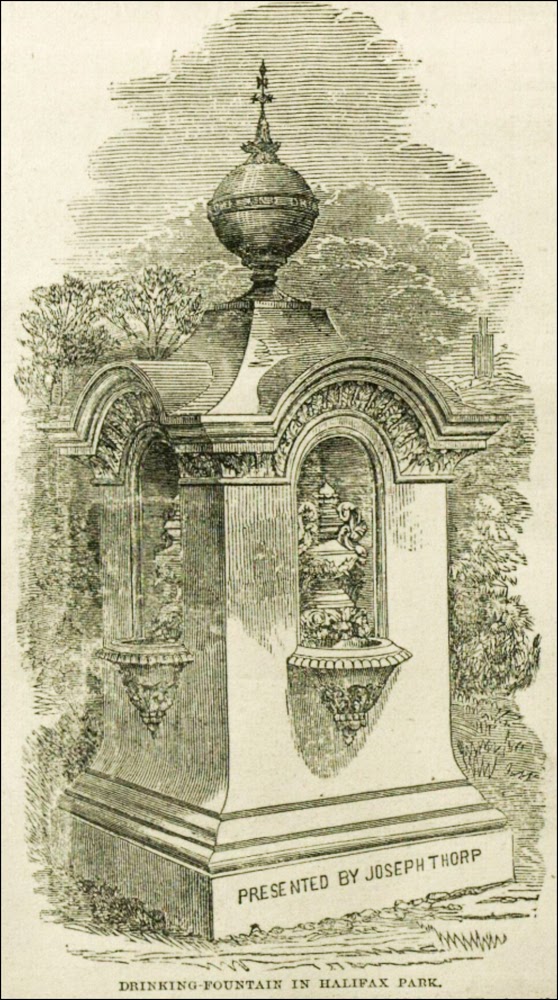 An article in the Illustrated London News of the 13th August 1859 reminds us of the gift of a water fountain to the people of Halifax by Joseph Thorp. The fountain was erected in People’s Park, where it stands to this day. Whilst such a gift, two or three centuries earlier, might have been mainly about providing a safe source of drinking water, Thorp’s Fountain in People’s Park – and a similar one located at the bottom of the Moor opposite St Jude’s Church – was as more about his support for the temperance movement than quenching the thirst of the hard working population of the town.