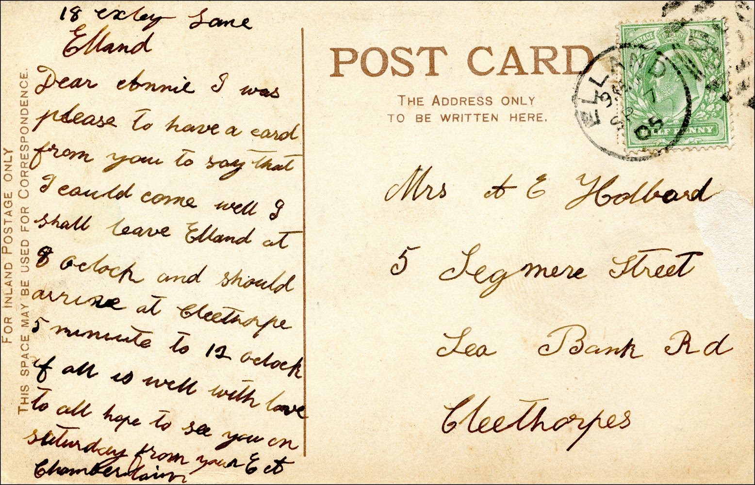 18, Exley Lane, Elland : Dear Annie I was please to have a card from you to say that I could come. Well I shall leave Elland at 8 o clock and should arrive at Cleethorpe 5 minutes to 12 o clock if all is well. With love to all, hope to see you on Saturday, from your E A Chamberlain.