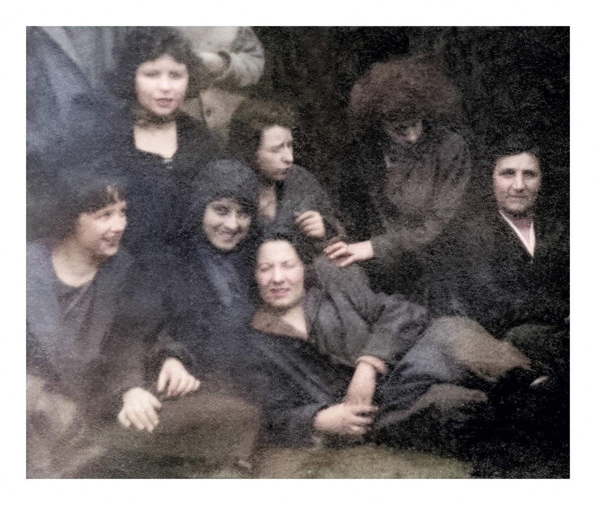 A detail taken from a found print of a group of unknown women – possibly fellow workers, possibly from the 1920s or 30s. In the main photo they seem to be gathered around a woman holding a banjo wrapped in brown paper. I have chosen to concentrate on a small section of the group, which provides a most pleasing arrangement of hands and faces.