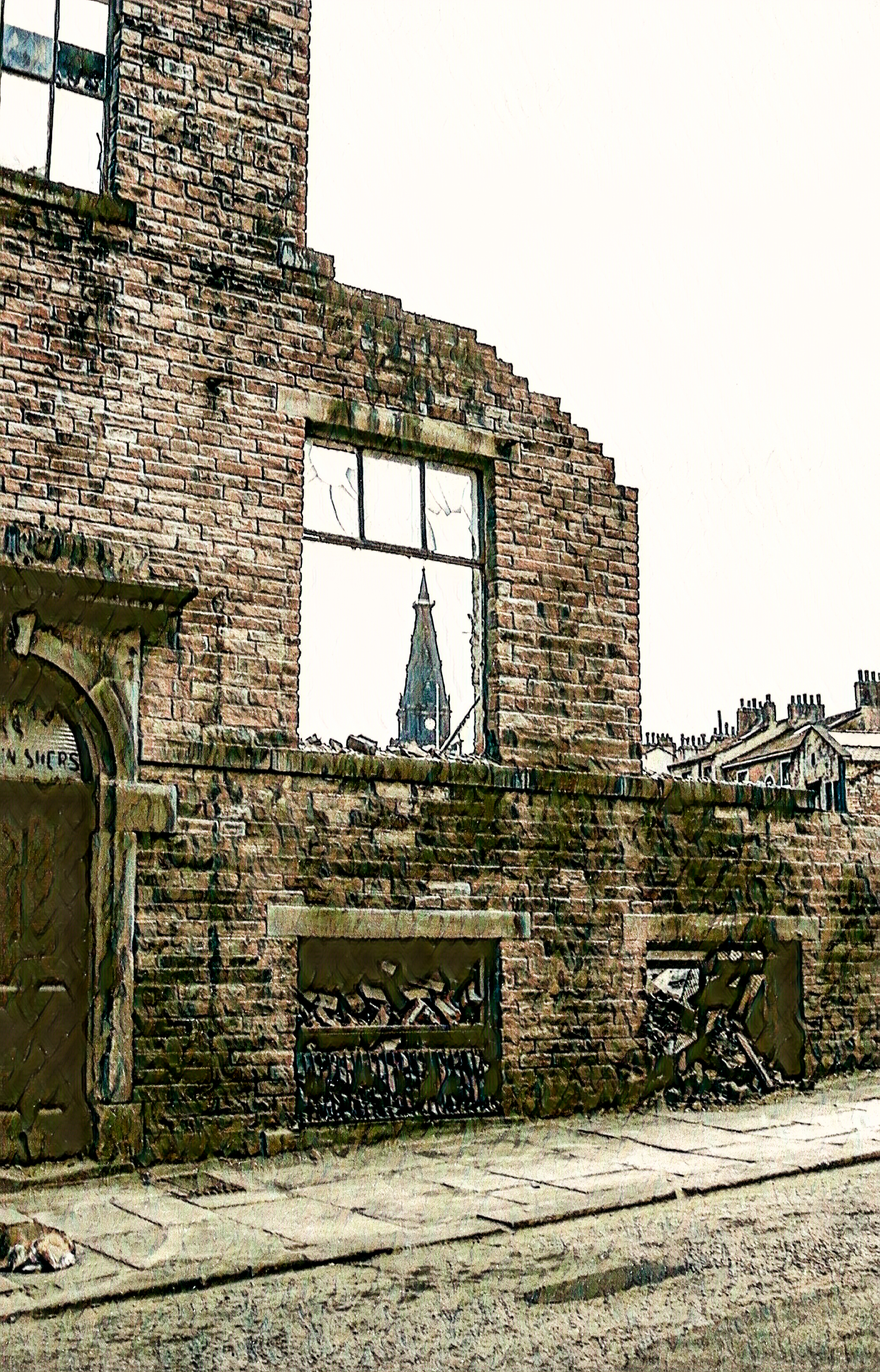 Halifax Town Hall framed in stone. Both the town hall and the half-demolished building on Winding Road (which was probably the works of Haigh, Allan & Co, Brass Founders and Finishers) must be of a similar vintage, but when I took this photograph in 1969, one was going, and one, thank goodness, was staying.