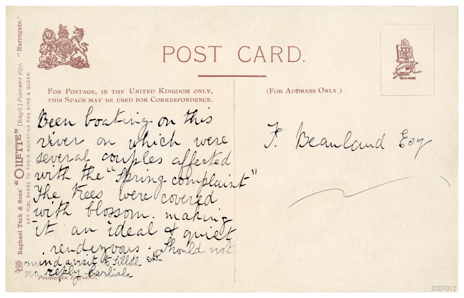 “Been boating on this river on which were several couples affected with the “Spring Complaint”. The trees were covered with blossom making it an ideal and quiet rendezvous. Should not mind a visit to Silloth. No reply Carlisle. AP”