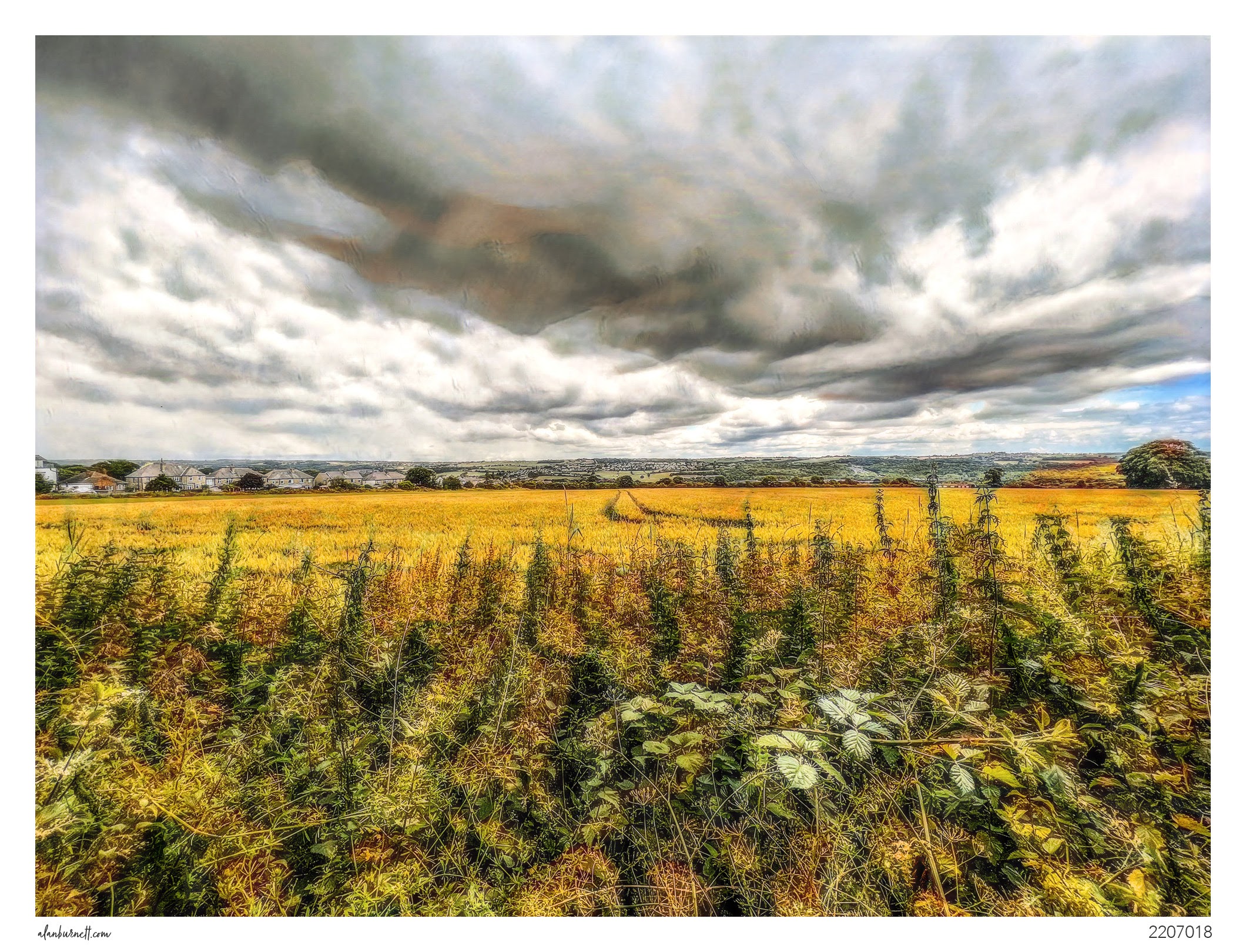 I accept that this might not be an accurate representation of the scene: the lens had an angle wider than a wheat field and the filters came from a paint box. Nevertheless accuracy can be an overvalued characteristic in photography. Taken from Shepherds Thorn Lane (///holly.risky.mutual), looking towards Brighouse and Clifton.