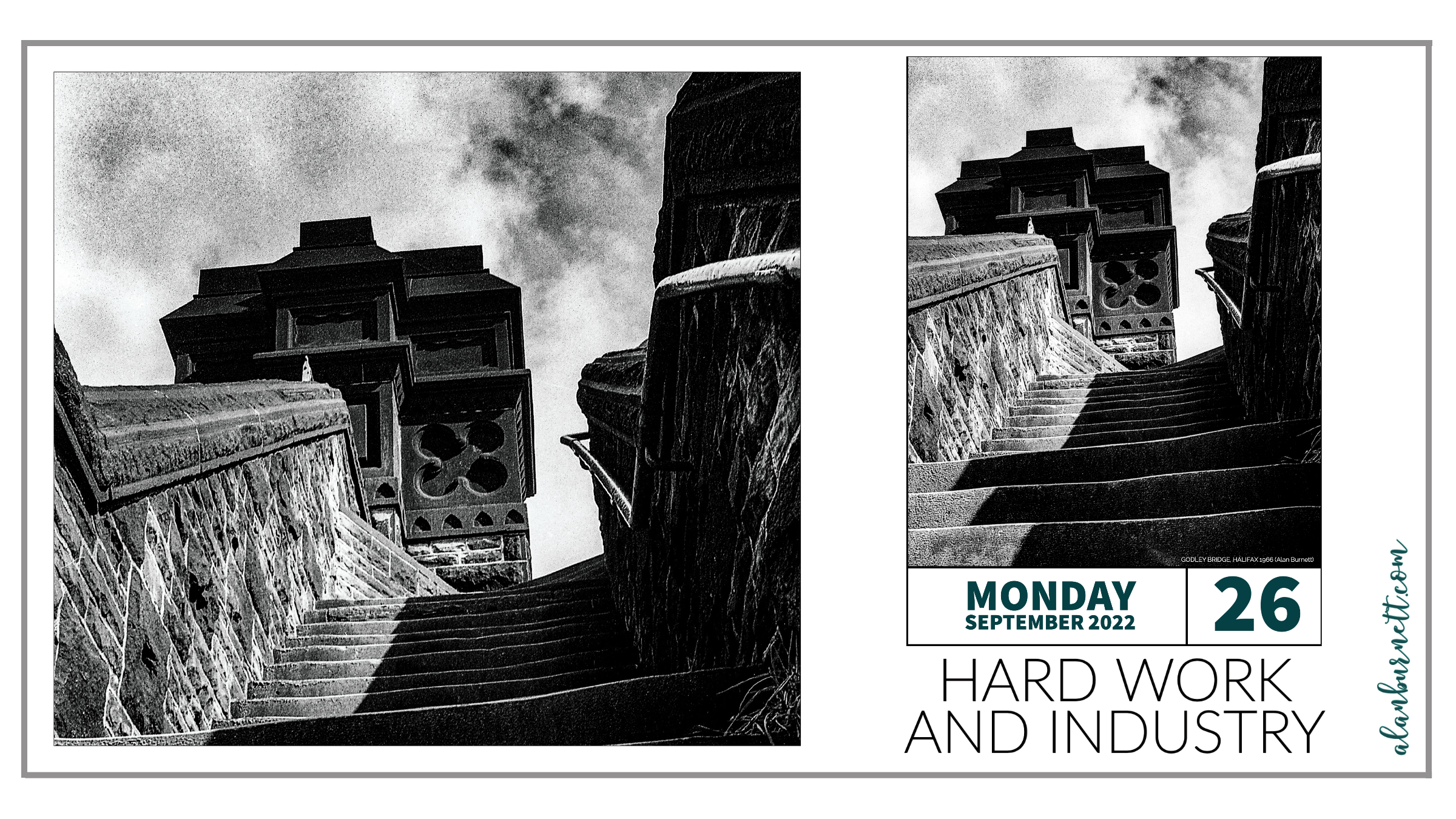 The steps leading up to Godley Bridge, Halifax’s answer to a triumphal arch. Built by the Borough Engineer in 1900 out of stone and cast iron; a monument to the power of hard work and industry. My photo dates back 60 years, although the steps are little changed today.
