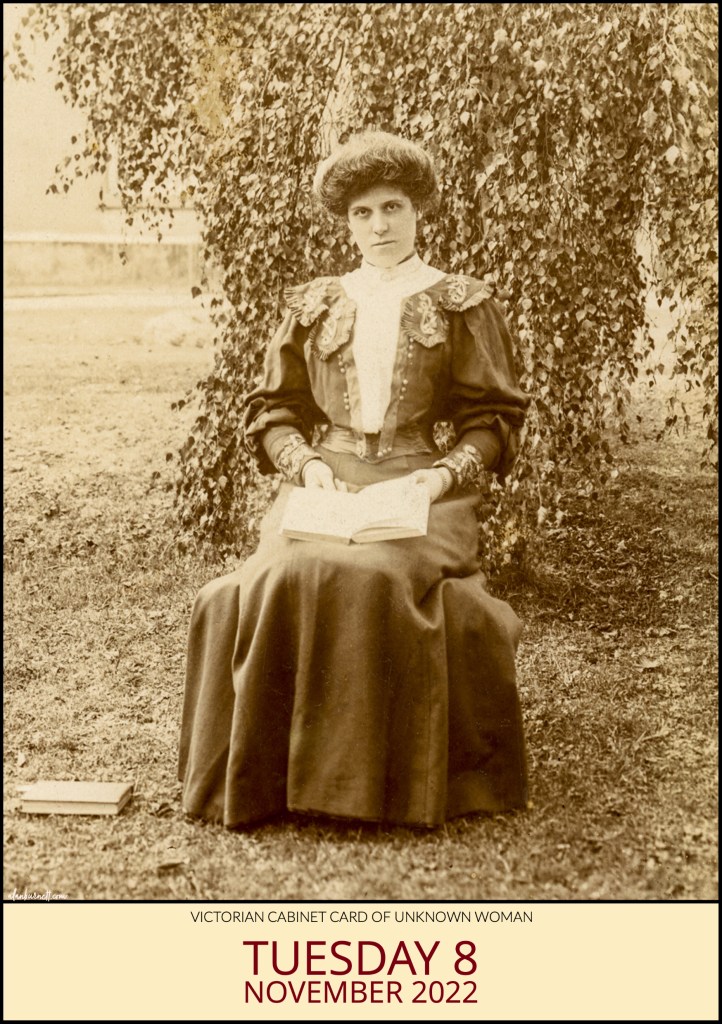 This is a “Cabinet Card” – a pasteboard-backed Victorian photograph – of an unknown woman sat reading under a tree. I suspect it might be from an amateur photographer – clues being the outdoor location and the lack of studio details on the rear of the card.