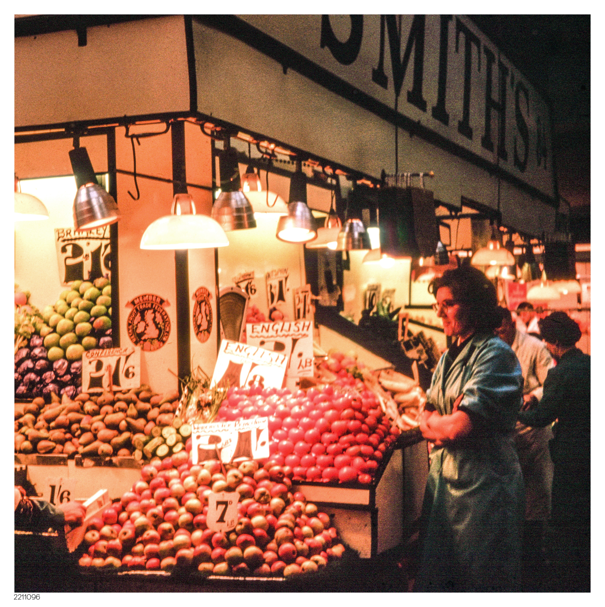 Halifax Borough Market. Not sure exactly when I took this photograph – obviously before the Great Decimalisation Divide (1971). To pin it down more precisely you would need an encyclopaedic knowledge of apple and pear prices in the 1960s. My guess – about 1966.