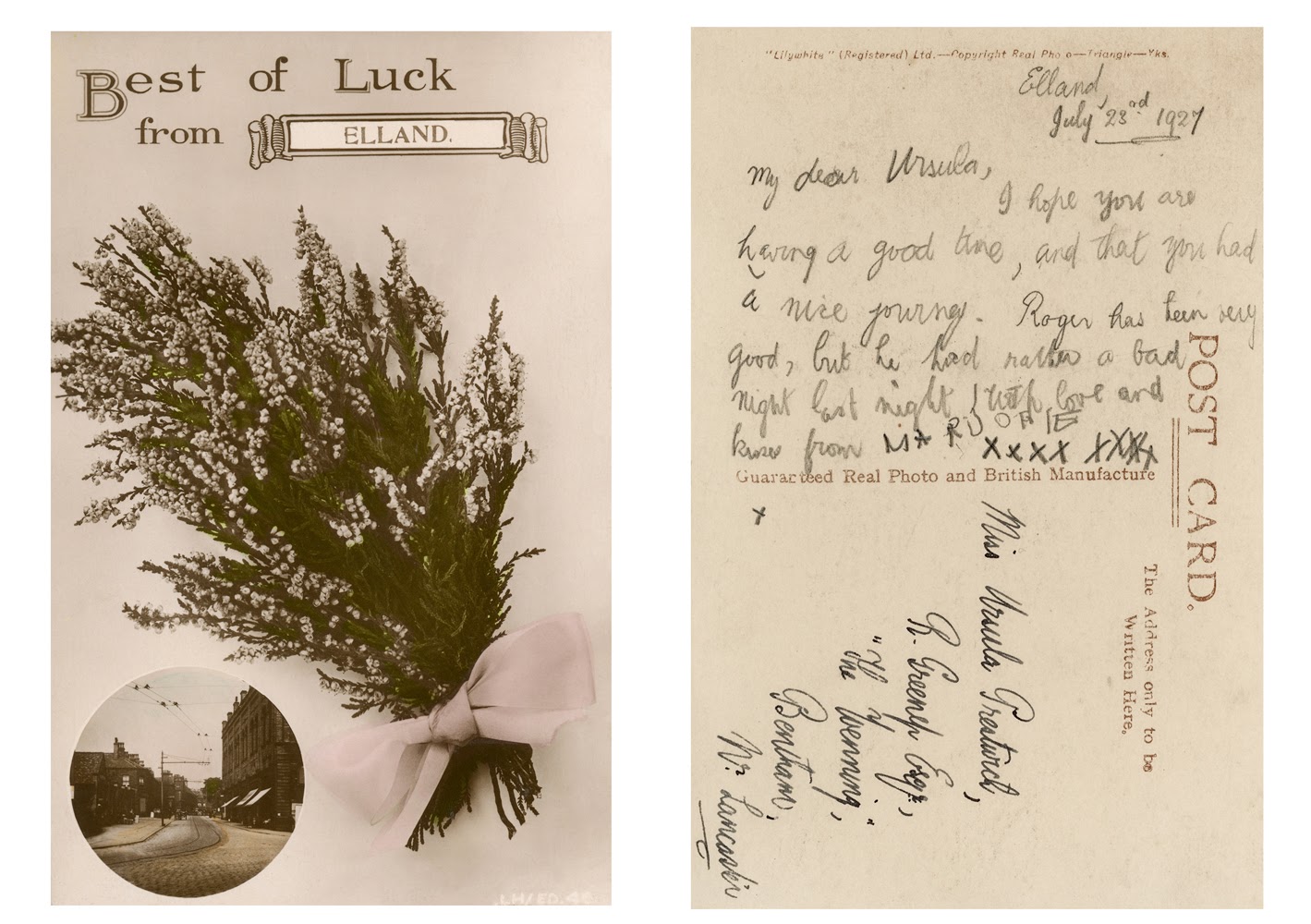 Elland, July 23 1927. My dear Ursula, I hope you are having a good time and that you had a nice journey. Roger has been very good, but he had rather a bad night last night. With love and kisses from M and (Roger)