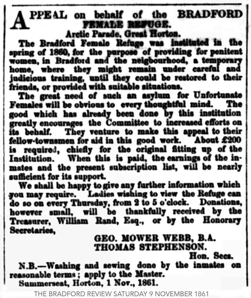 I assume that by the time my father was growing up on Arctic Parade, in the 1920s, the Female Refuge had long gone: certainly no mention was ever made of it in the family stories. I would have liked to know more about growing up in this part of Bradford 100 years ago, but so much of the history has died with a generation which, is now, long gone. But at least I have the photograph.