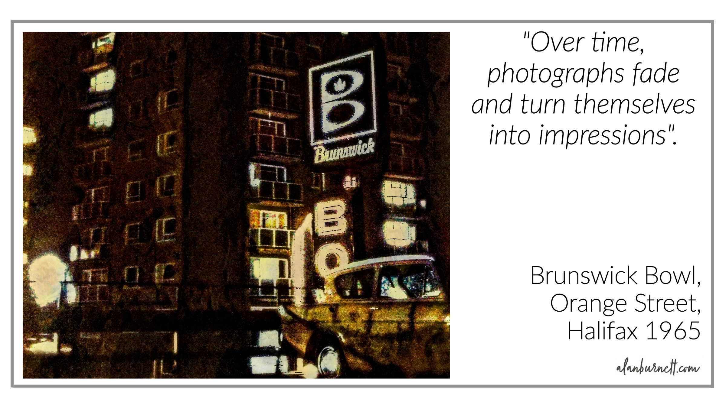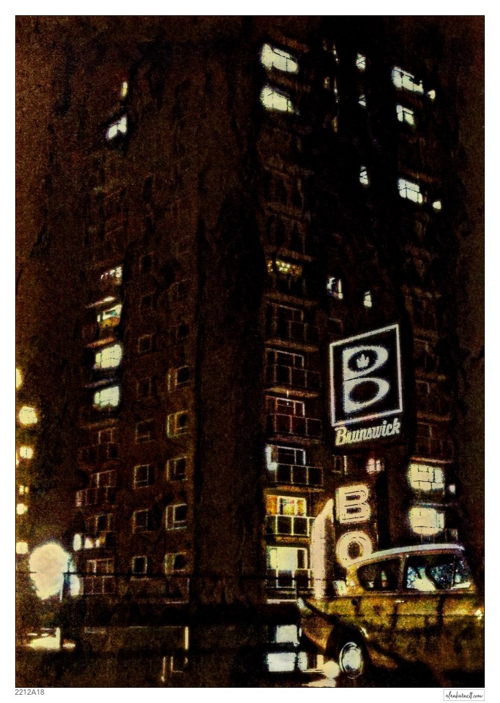 The photograph dates back to the mid 1960s: a time when Halifax was trying to reinvent itself as a modern trans-Atlantic town, complete with bowling alleys, high-rise flats, coffee bars and neon lights. Halifax, after all, was the home of Anglo-American Chewing Gum, so where better to build a concrete bowling alley complete with an oversized plastic bowling pin. The photograph has faded over time, so all that is left is an impression of the Halifax of my youth.