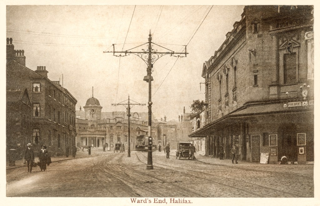 I’ve recently acquired this picture postcard of Ward’s End in Halifax. Although it is new to me, it is anything but new – having been posted the best part of one hundred years ago. The photograph on the front of the card is probably a good ten years older than that; dating from an age when tramcars outnumbered motor cars, and horse and carriages could still be seen in the distance. The original photo was somewhat faded, relatively grubby, and lacking in contrast, but a little restoration work brought it into focus, and a dusting of colour helped to bring a bit of life to the scene.