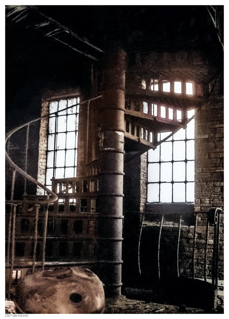 The wonderful thing about old 35mm negatives is that they come in strips. I used to always process my own, and cut them into strips of six negatives for storage, and this has preserved a degree of continuity when it comes to the relationship between individual photographs, half a century or more down the line. Thus I can take this particular strip of negatives, which were taken about 50 years ago, and almost follow my route as I walked from Halifax Station, past the Town Hall, and on towards North Bridge and its’ railway sheds. After yesterdays’ photograph of the exterior of the wagon shed, I obviously stepped inside the deserted building for my next shot, and this is the one that is featured above.