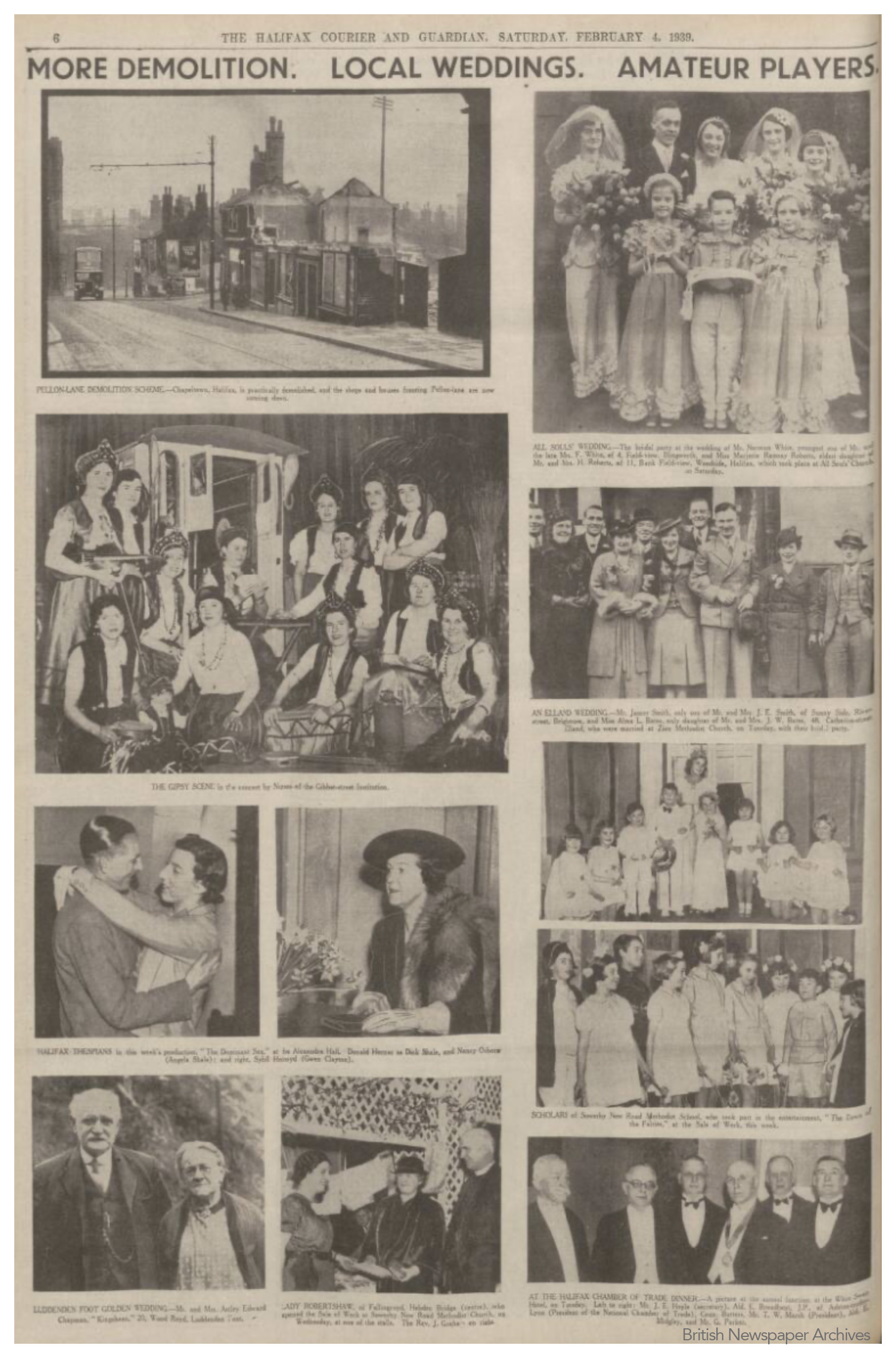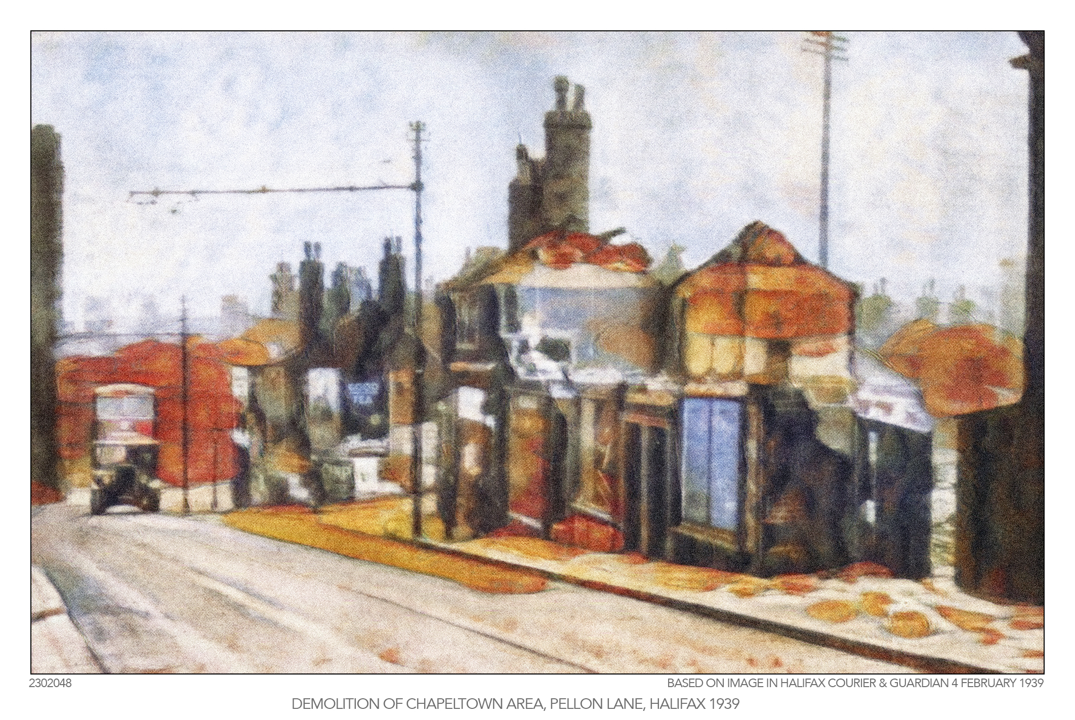 My image today is based on a Halifax Courier photograph of the demolition of the Chapeltown area of Halifax in 1939. Chapeltown, near the bottom of Pellon Lane, was an area where a large number of common lodging houses were located – along with the town’s dungeon.