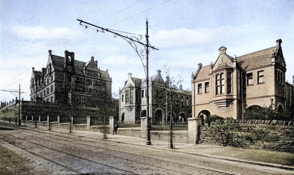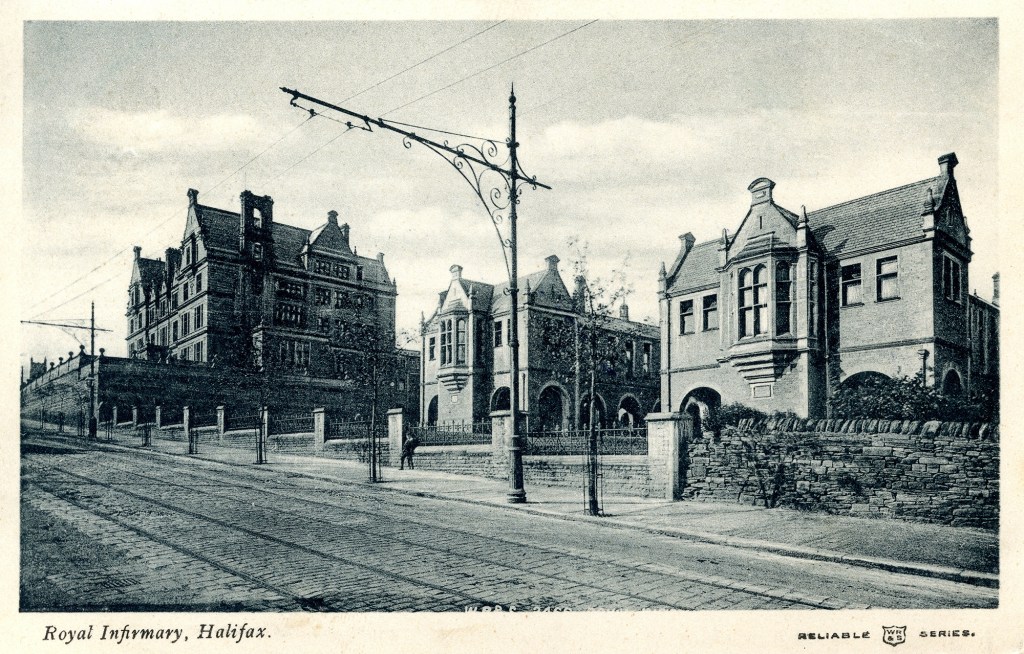 This is a picture postcard from the very beginning of the twentieth century featuring a photograph of the Royal Infirmary, Halifax. When this photograph was taken the building will have only been a few years old (it was opened in 1896), and the building remained largely unchanged until it eventually closed in 2001. One of the last departments to leave was the Pathology Department and my wife was a doctor there at the time. By then the building was full of ghosts and creaking timbers and I suspect you could still hear the trams rattling past, even though the lines had been ripped up sixty years before that. Some of the buildings you can see in this photograph still remain, although they have now been converted into houses and apartments. Now the site looks domesticated, but at its height, the whole complex radiated disinfectant and invalid broth.