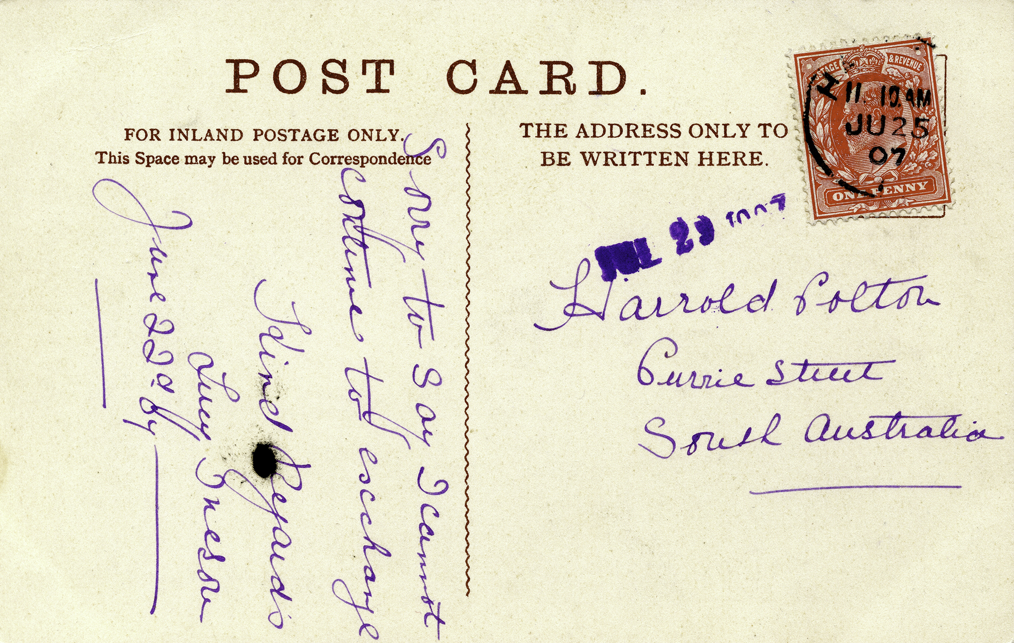 The reverse of the card reveals that it was sent by Lucy Ineson to “Harrold Colton” at the remarkably truncated address of “Currie Street, South Australia”. I suspect that the Lucy Ineson concerned was the then 13 year old daughter of Thomas Ineson a florist and fruiterer of Hammond Street in Halifax. The recipient of this rather brief message is far more intriguing because it turns out that the “Harrold Coltron” is not some misspelled beau, but a rather famous hardware shop in Adelaide, the capital of South Australia. As with all found postcards, you long to know the back-story. I have some thoughts of my own, but as Lucy said all those years ago, “sorry to say I cannot continue to exchange”