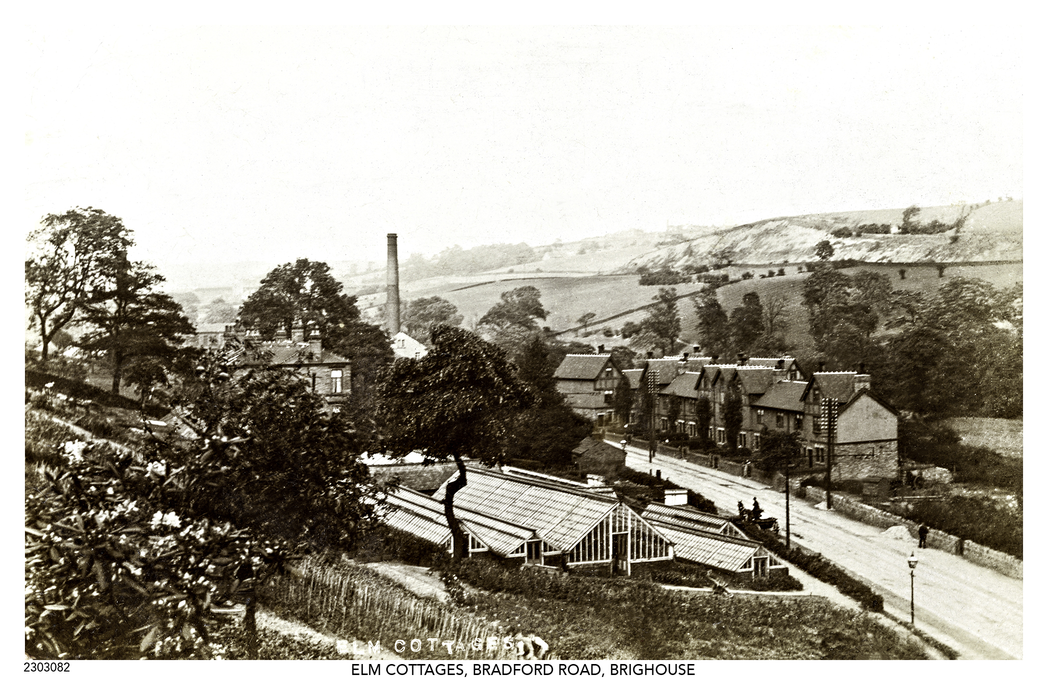 I bought this old picture postcard of Elm Cottages which still stand on Bradford Road between Brighouse and Bailiff Bridge because of the subject matter. The photograph captures landscape I am very familiar with, but captures it 100 years in the past. For those who live in these parts it is full of fascinating detail – the tramlines on the road, the greenhouses which were part of Kershaw’s market gardening business – the street lights, the mill chimney, the past.