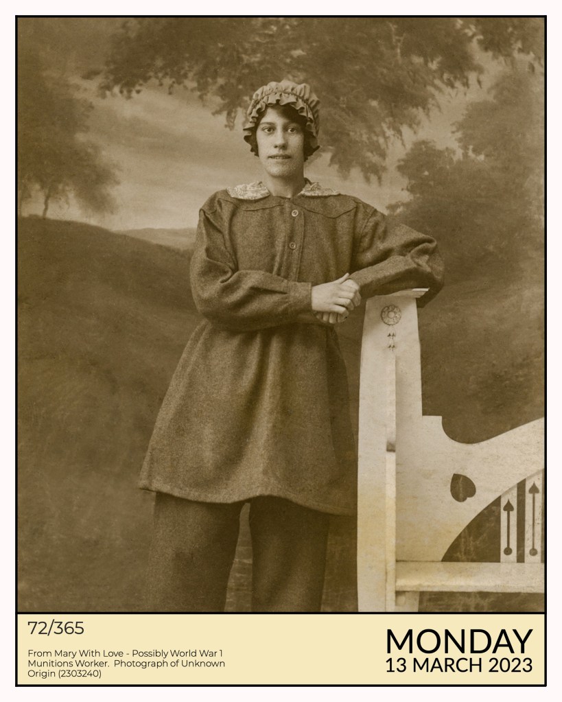 On the reverse of this small photograph was written “From Mary With Love” I have no idea who Mary was, but the outfit is somewhat reminiscent to those wore by munition workers during World War 1.