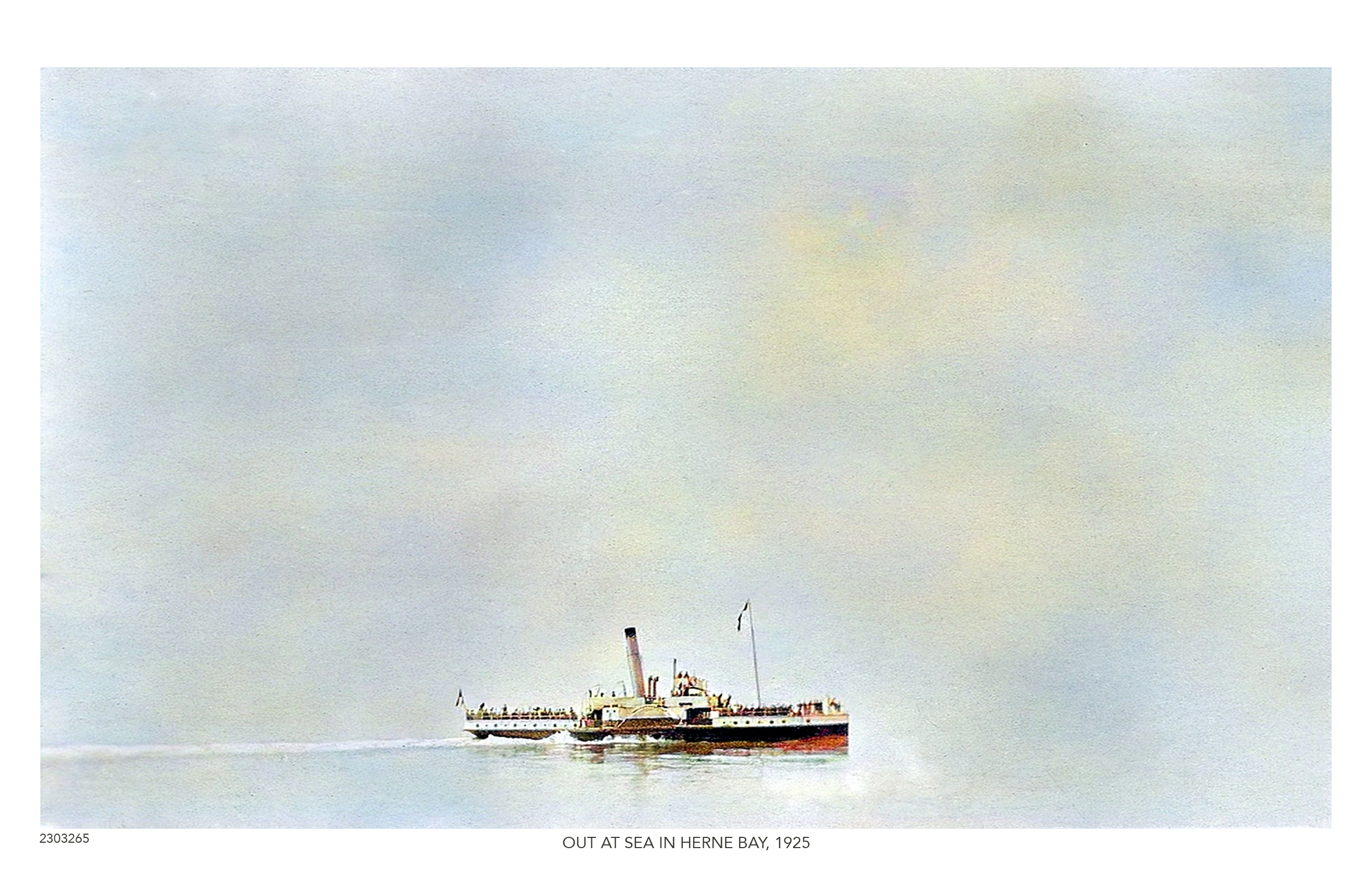 This print started life as a tiny, faded sepia image of a paddle steamer at sea off the coast of Herne bay in 1925. Interesting, but not necessarily stunning. Tidy the image up, get rid of the scratches and the blotches, add some colour – and what emerges from the digital developing dish was something quite different, something a little magical.