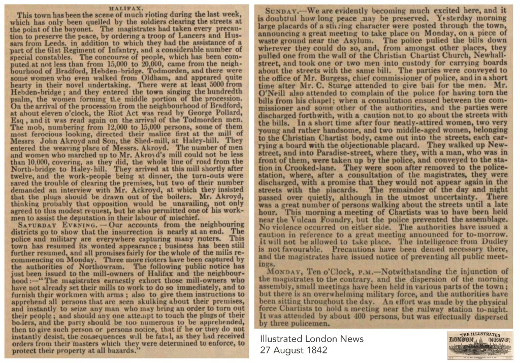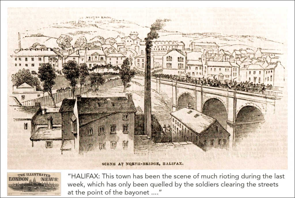 The chance discovery of an illustration in an old newspaper, brings to light a troubled time in the history of Halifax. The illustration – Scene at North Bridge, Halifax – appeared in the Illustrated London News of the 27th August 1842, and it shows thousand of protestors on North Bridge coming under attack by armed troops during the so-called “Plug Riots”. The accompanying article describes how 10,000 to 15,000 Chartists descended on the town on the weekend of the 15th and 16th August with the intention of shutting down local mills in support of a General Strike by removing the “plugs” from the boilers that drove the textile machines. The response of the authorities was to call in the troops who, following the reading of the Riot Act, set about clearing the streets “at the point of the bayonet”. In the days that followed, protesters were arrested and meetings broken up.