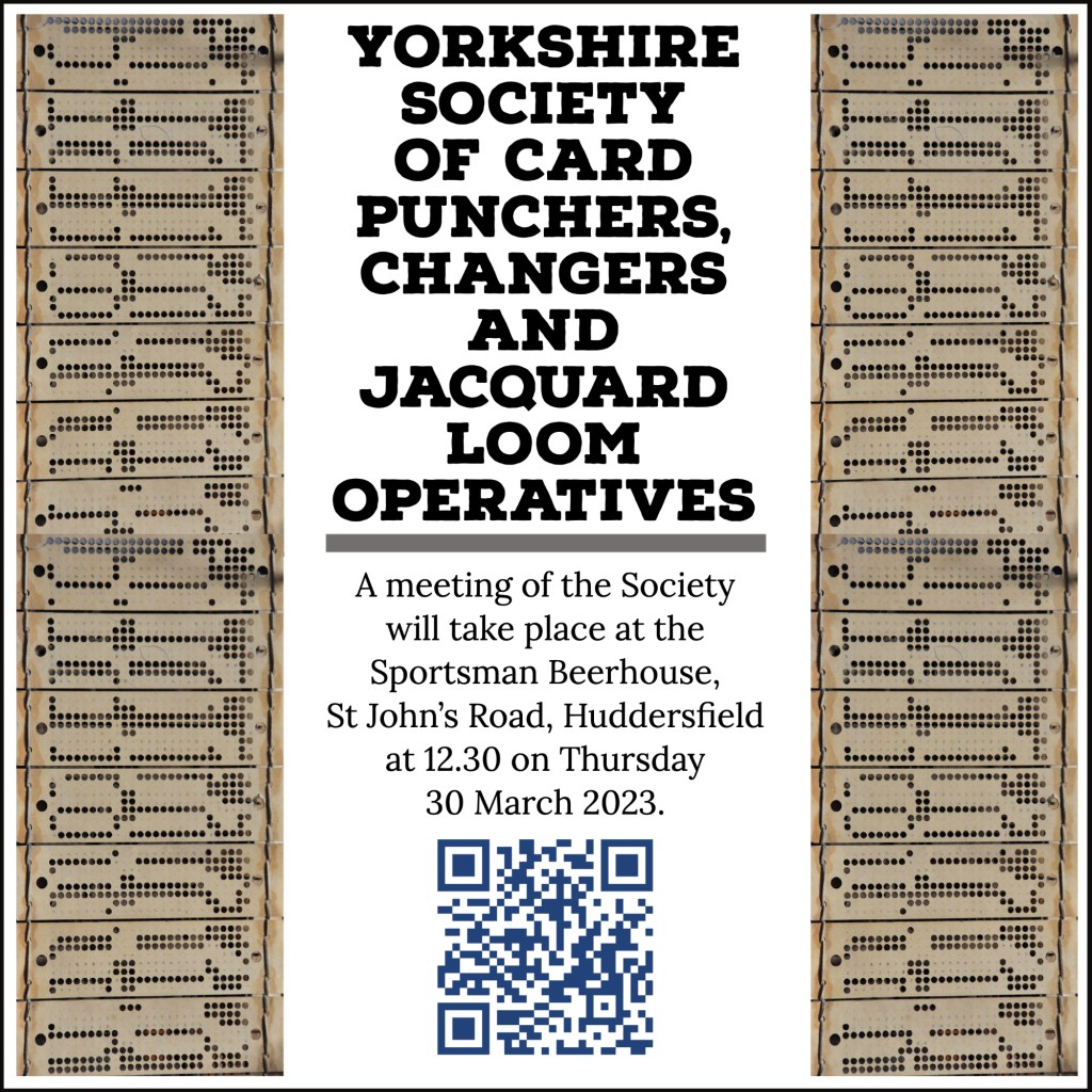 You are cordially invited to attend the monthly meeting of the Yorkshire Society of Card Punchers, Changers and Jacquard Loom Operatives to be held at the Sportsman Beerhouse, Huddersfield on Thursday 30 March 2023 at 12,30pm.