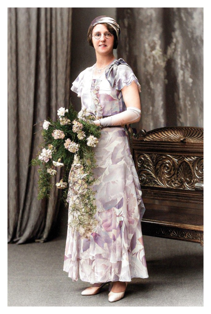 This photograph is simple identified on the back with a caption saying “Uncle Harry’s Cousin”. The uncle was Harry Moore, husband of my father’s sister, Annie. I have no idea, however, who the cousin was – but what a lovely dress! The original print was a faded sepia – but with the help of a little artificial intelligence, the colours come out wonderfully.