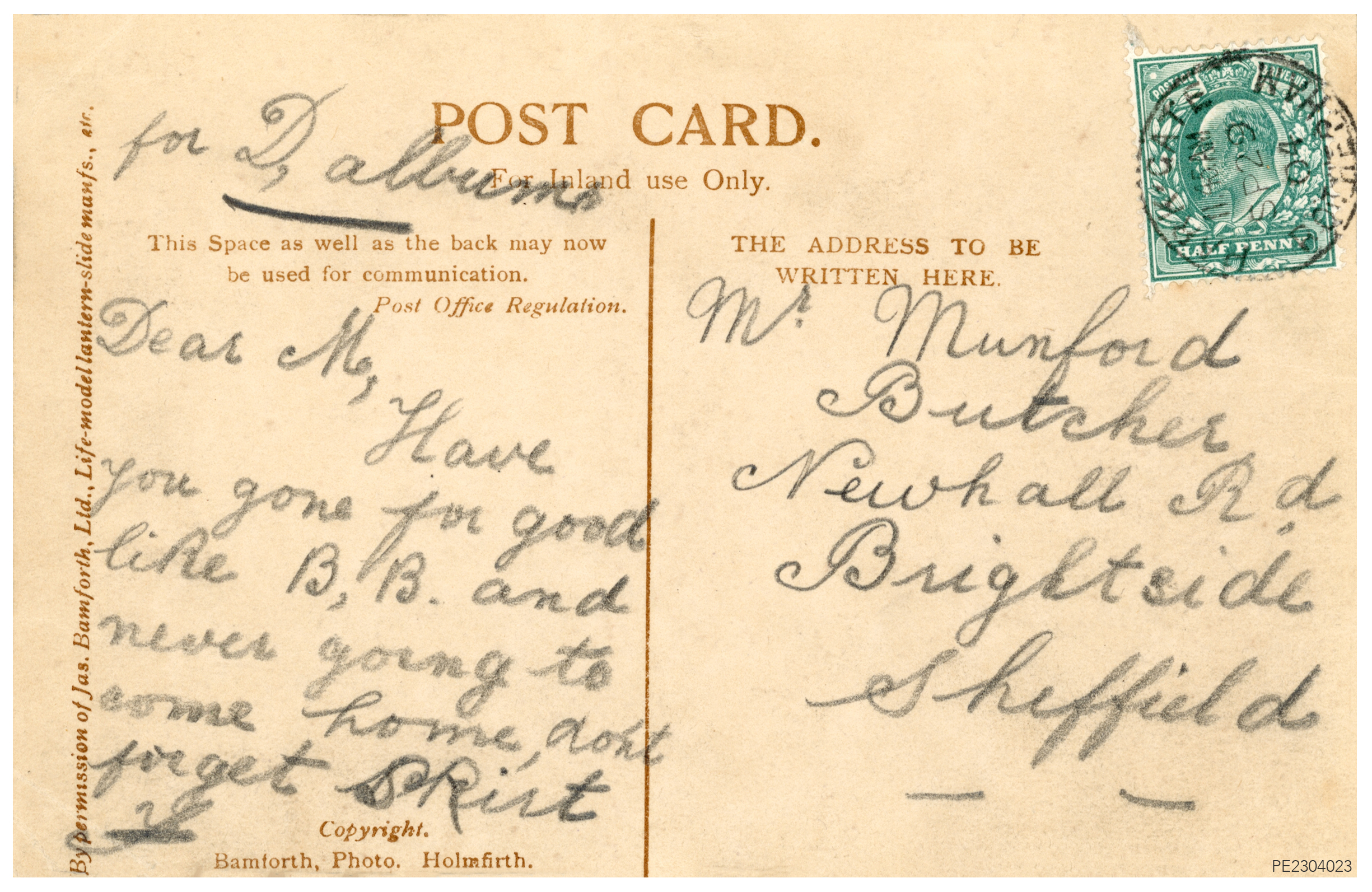 The message on the reverse of the card is equally full of unanswered questions. Will Mr Mumford, the butcher of Brightside, ever make it home? Who knows!