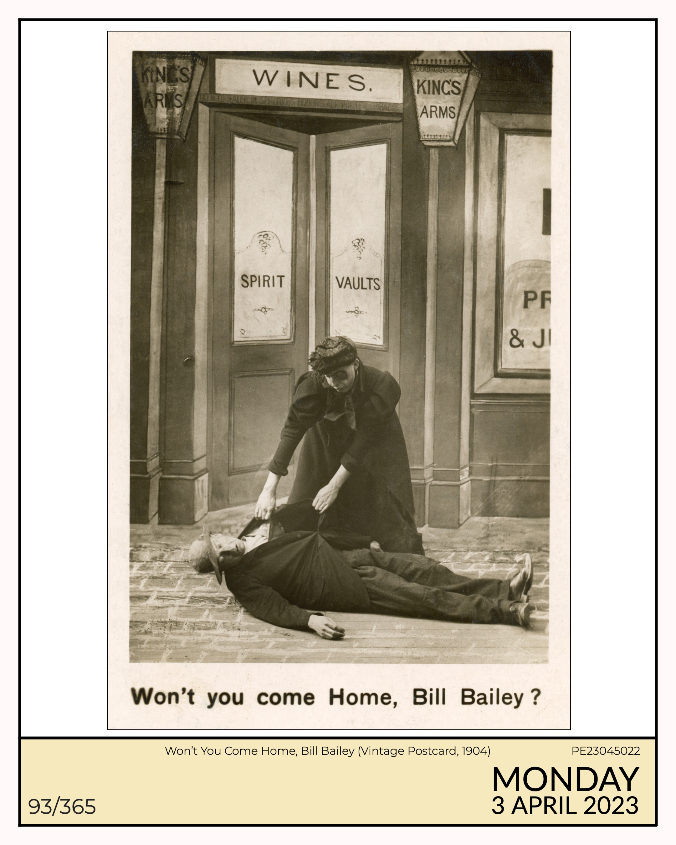 Perhaps the most surprising thing about this vintage postcard is the date. It was posted in 1904 and we must assume that by that time, the “Bill Bailey” song was widely known. The lyrics of the song – which was written and composed by Hughie Cannon two years before this cards was sent – tell the story of a man thrown out of his house by his wife who subsequently changes her mind. The image on the card changes the context somewhat and makes you question why anyone would possibly want Bill Bailey back in the state he is in!