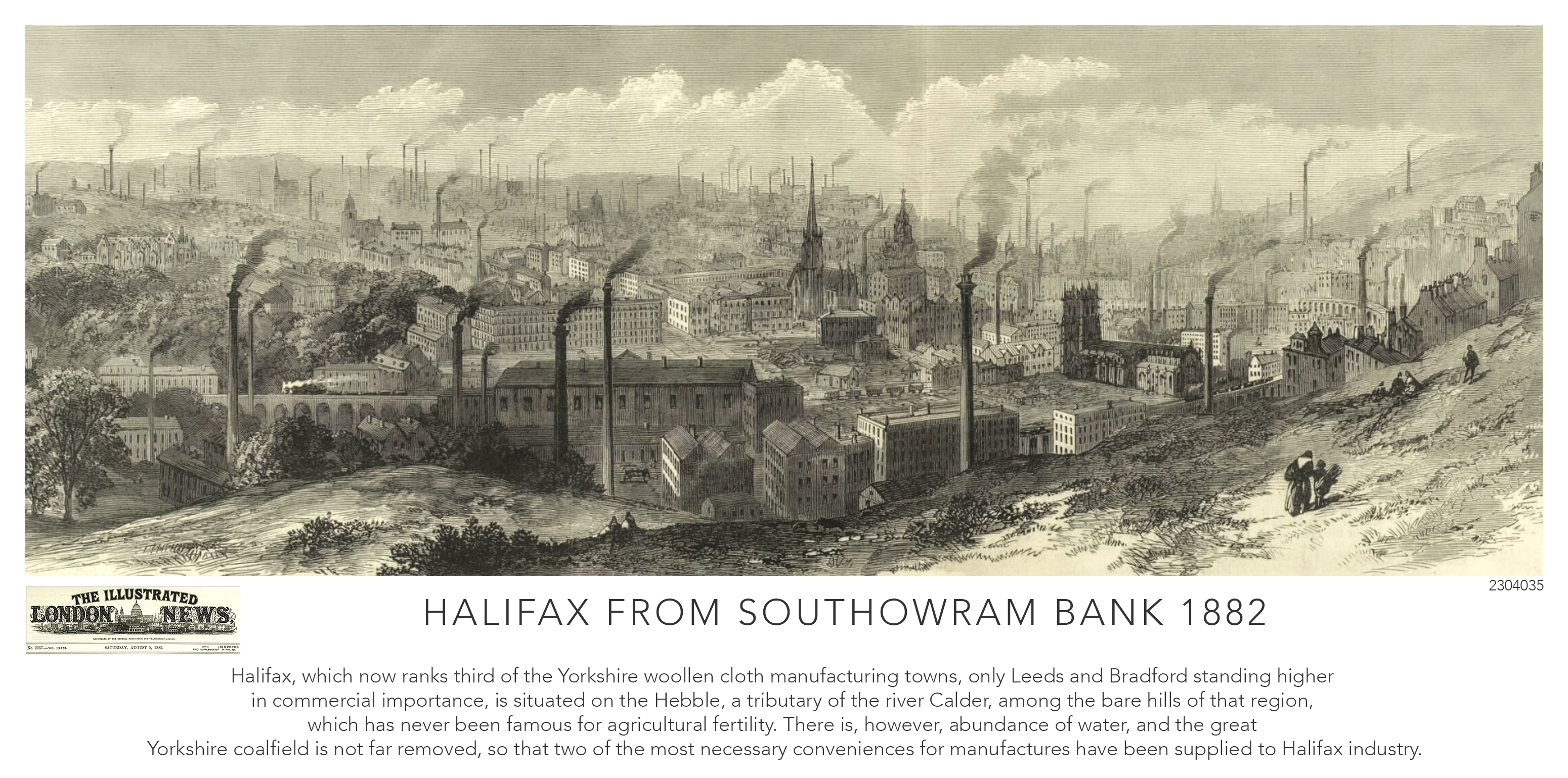 One of the most striking of these illustrations is a view of the town from Southowram Bank. The enormous number of mill and factory chimneys visible is witness to the busy industry of the town, and this is underlined in the short article which accompanies the feature:-