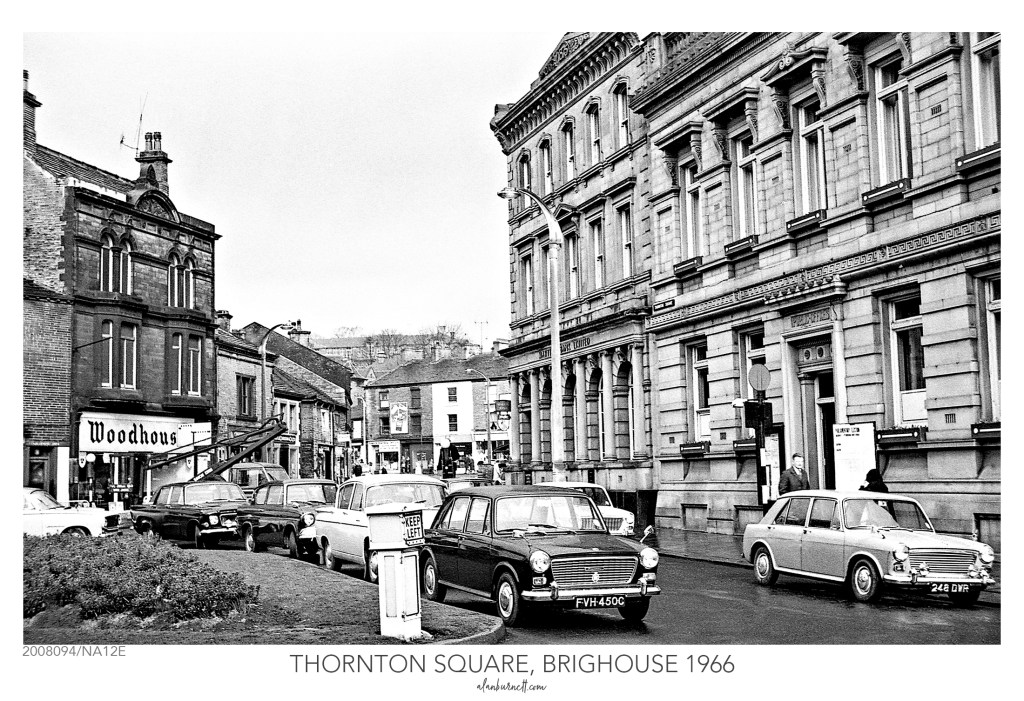 Photographs of streets always provide a fascinating insight into the past. The backdrop – the shape of the buildings and the layout of the streets – may last for centuries, but the decorations – the shop names and signs, the parked cars, the people – change all the time. This was Brighouse over half a century ago – an age of Martin’s Bank and Ford Anglias.